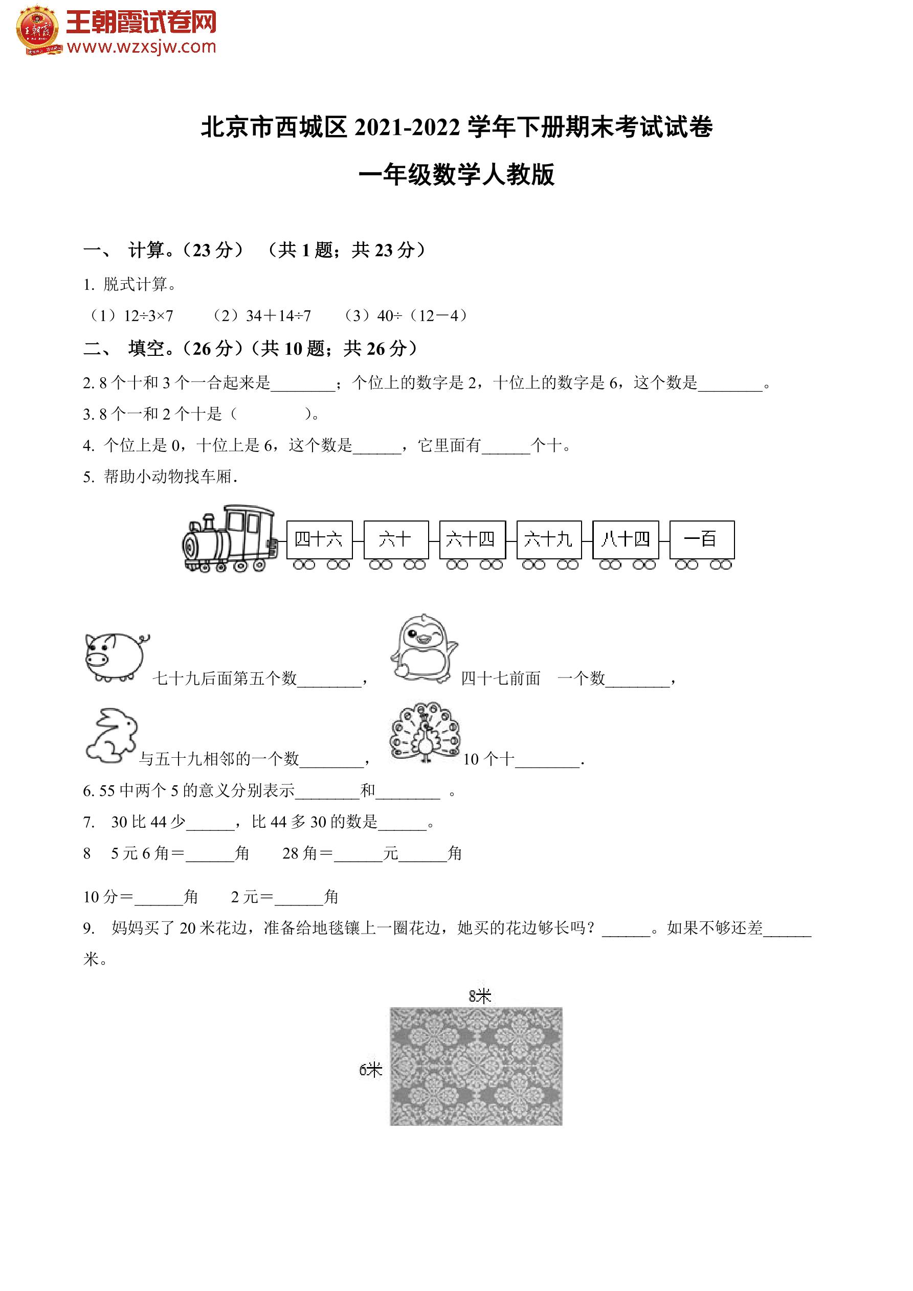 北京市西城区2021-2022学年下册期末考试试卷一年级数学(人教版)