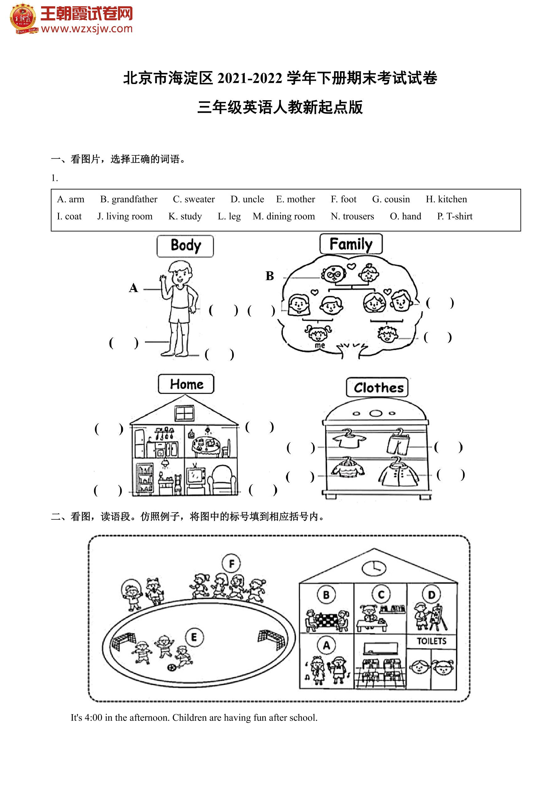 北京市海淀区2021-2022学年下册期末考试试卷三年级英语(人教新起点版)【无听力音频】