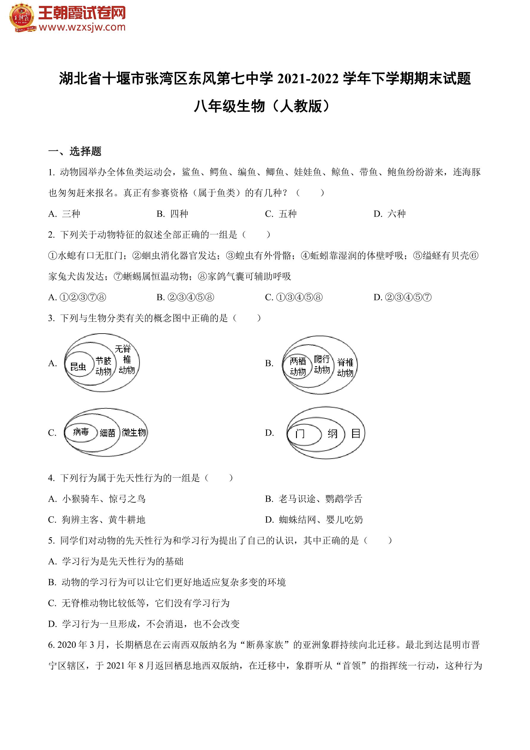湖北省十堰市张湾区东风第七中学2021-2022学年下学期期末试题八年级生物(人教版)