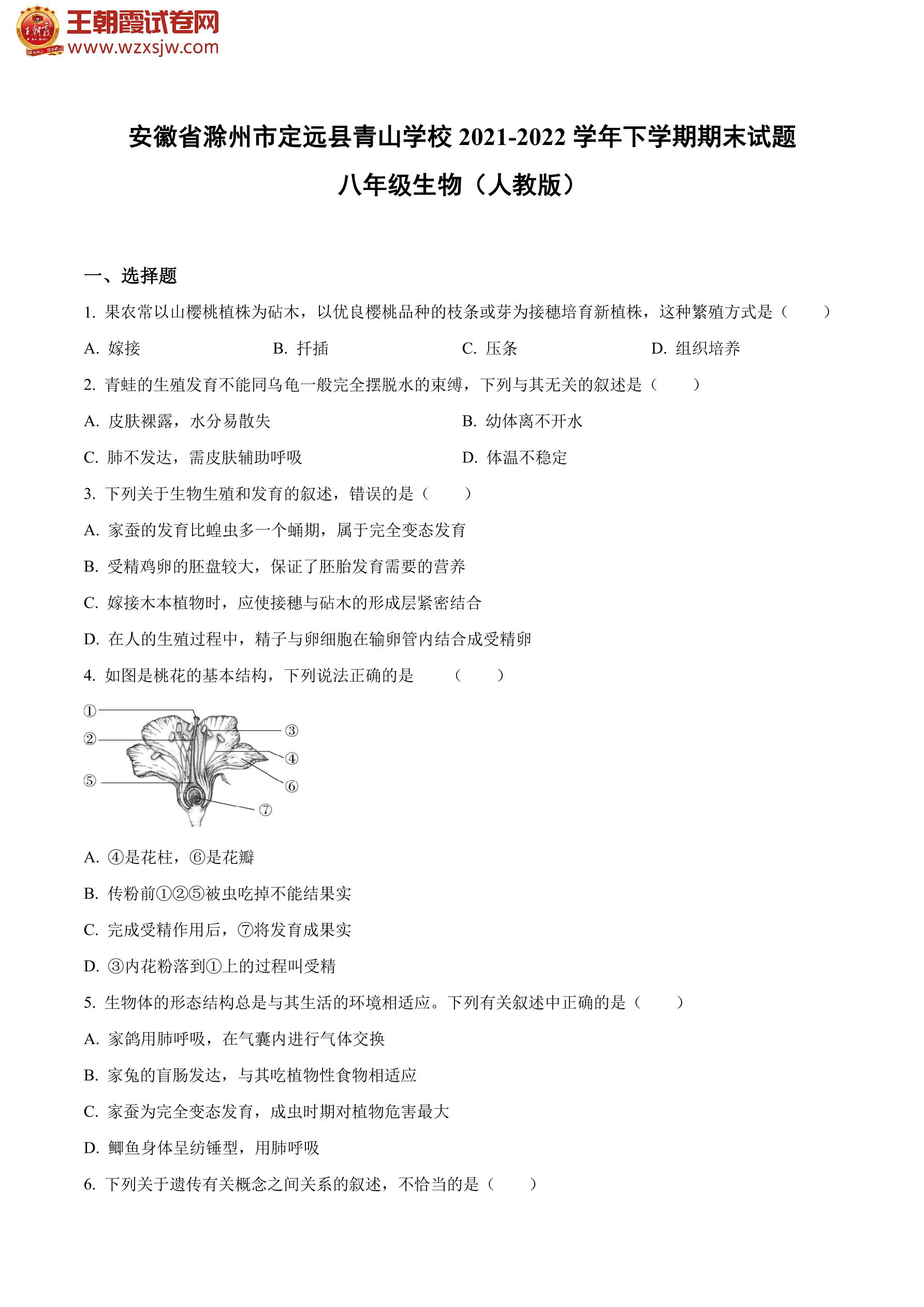 安徽省滁州市定远县青山学校2021-2022学年下学期期末试题八年级生物(人教版)