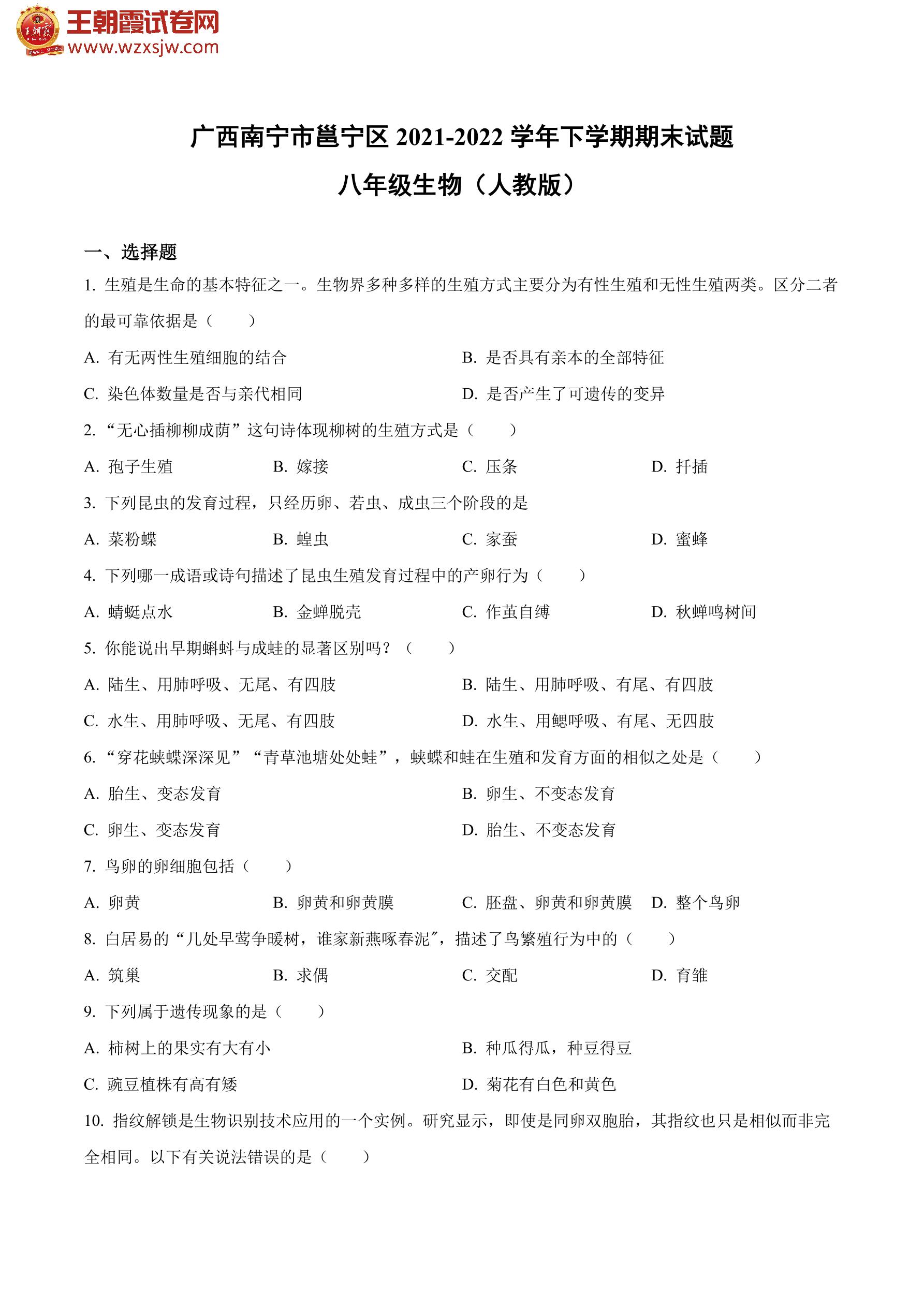 广西南宁市邕宁区2021-2022学年下学期期末试题八年级生物(人教版)