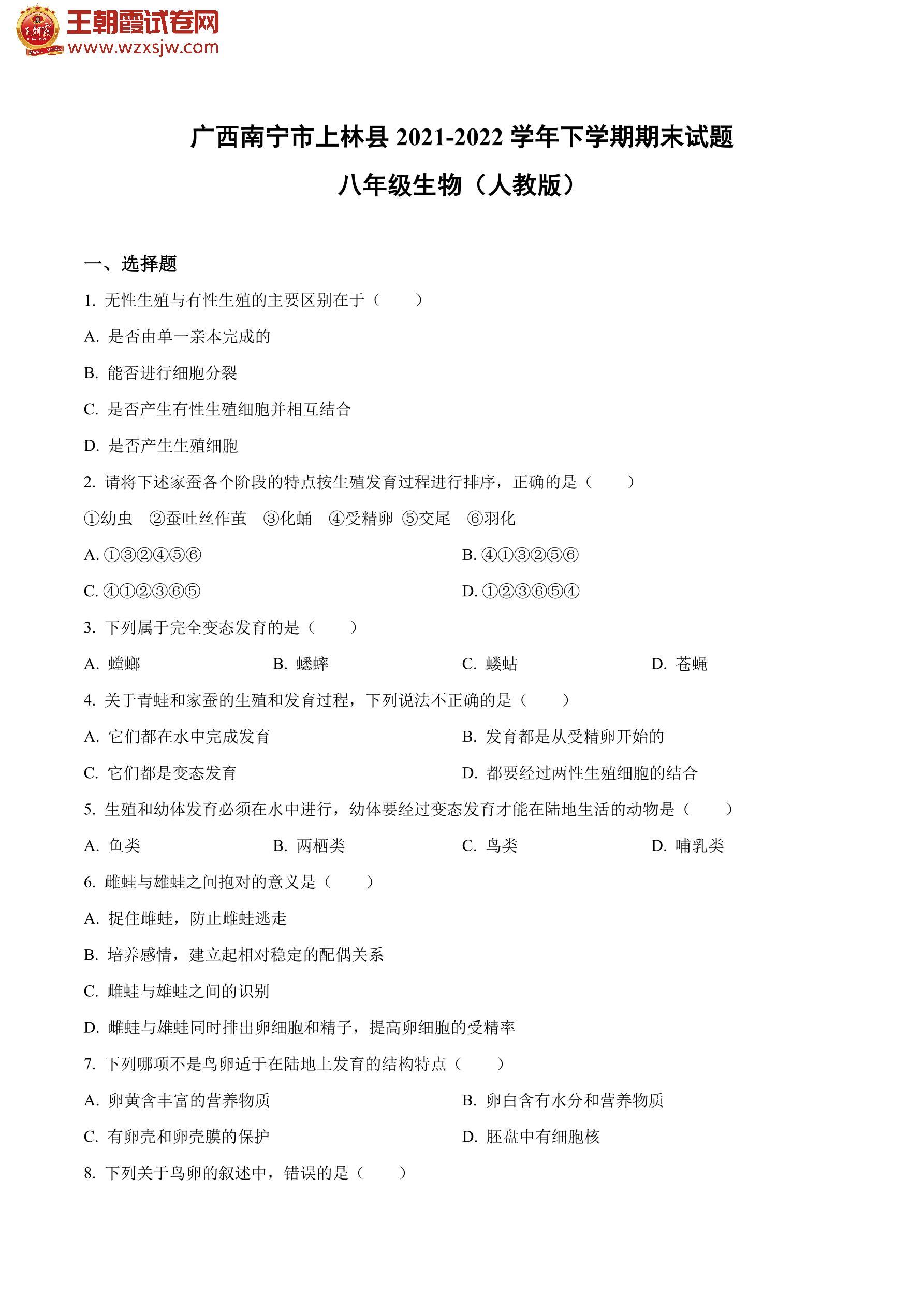 广西南宁市上林县2021-2022学年下学期期末试题八年级生物(人教版)