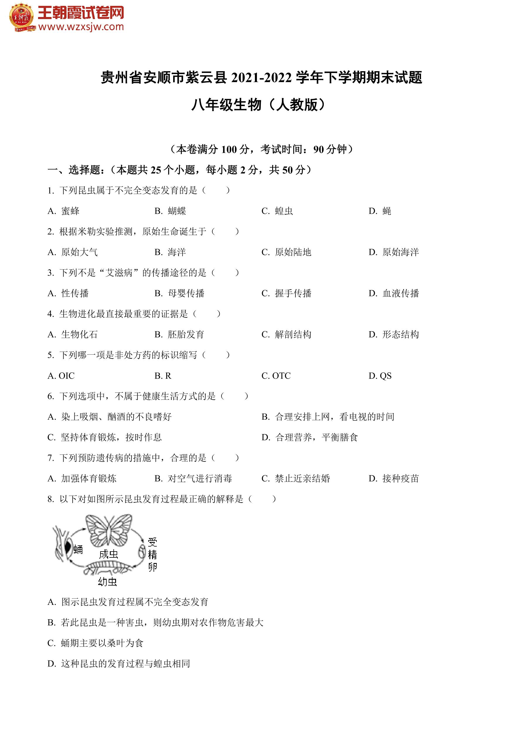 贵州省安顺市紫云县2021-2022学年下学期期末试题八年级生物(人教版)