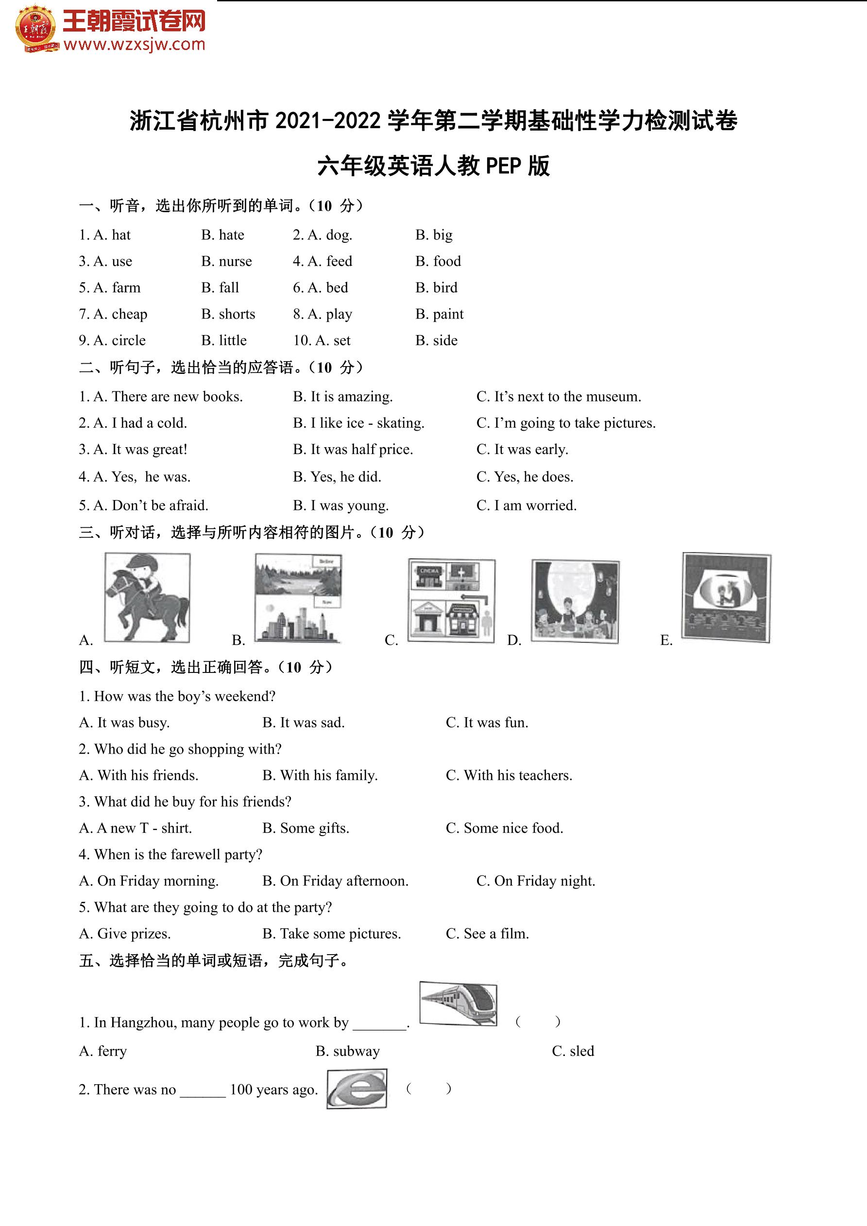 浙江省杭州市2021-2022学年第二学期基础性学力检测试卷六年级英语(人教PEP版)【无听力音频】