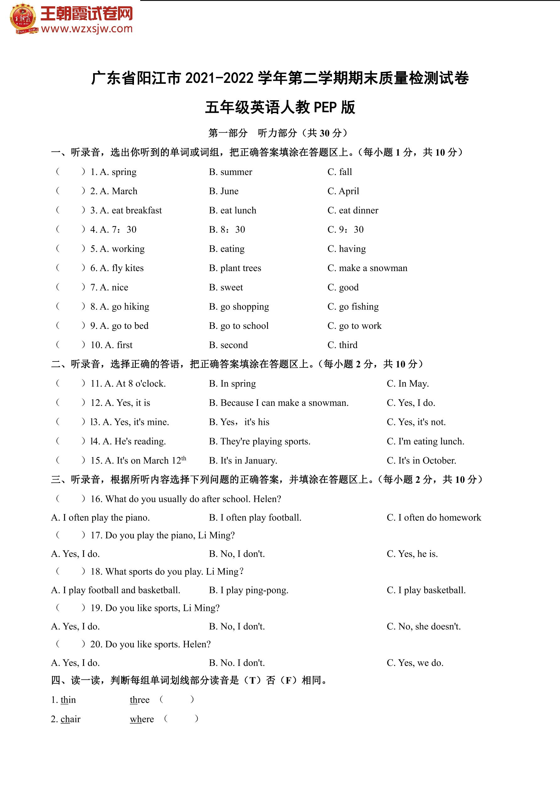 广东省阳江市2021-2022学年第二学期期末质量检测试卷五年级英语(人教PEP版)【无听力音频】