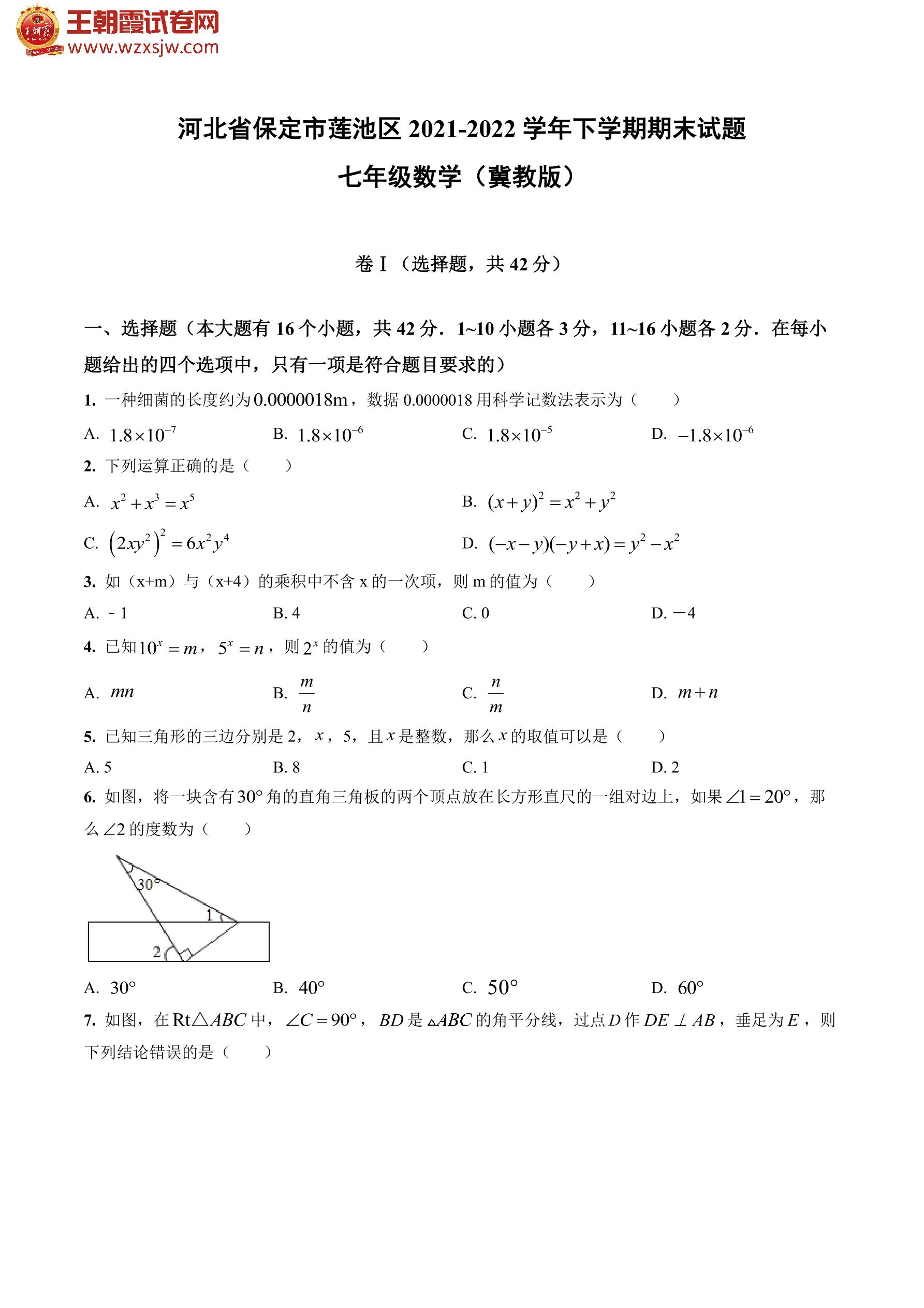 河北省保定市莲池区2021-2022学年下学期期末试题七年级数学(冀教版)