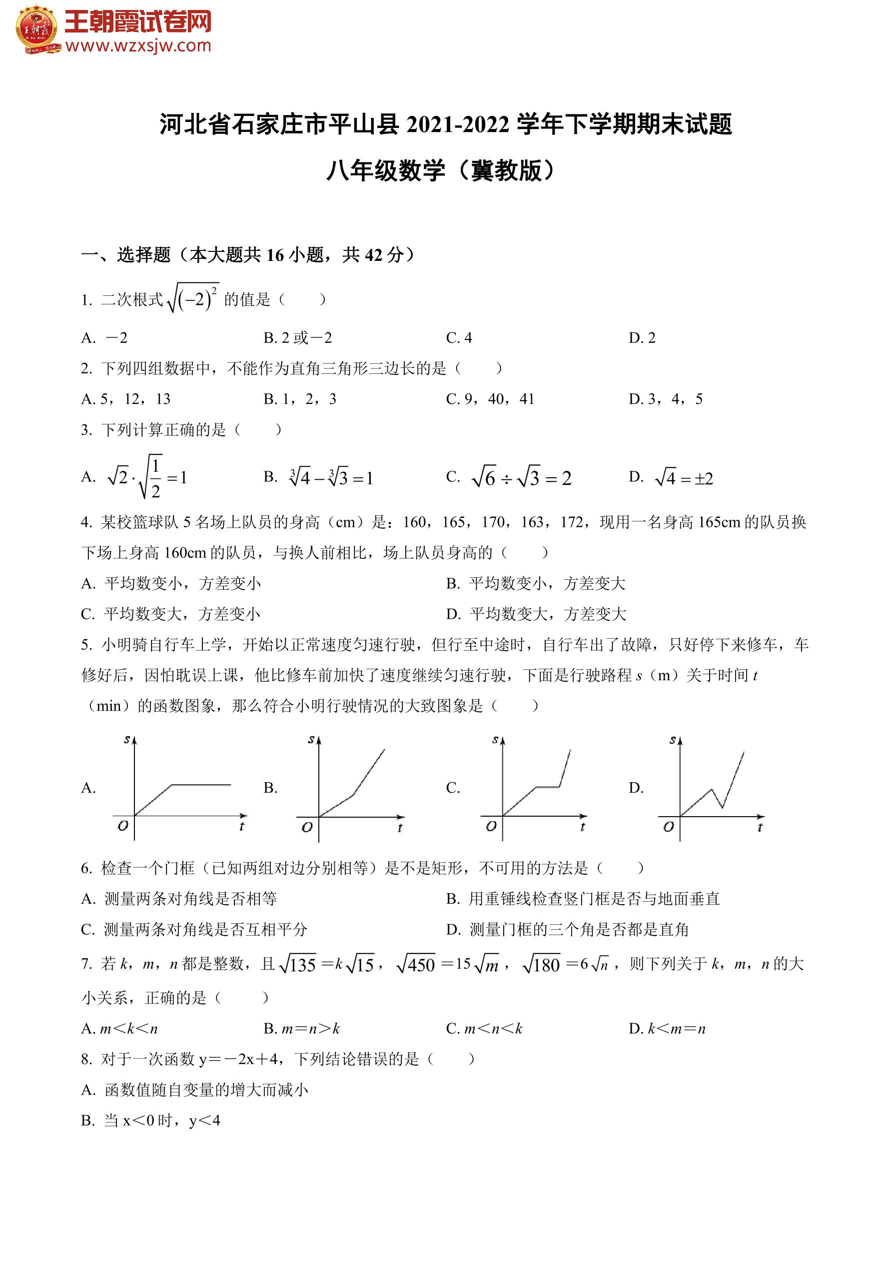 河北省石家庄市平山县2021-2022学年下学期期末试题八年级数学(冀教版)