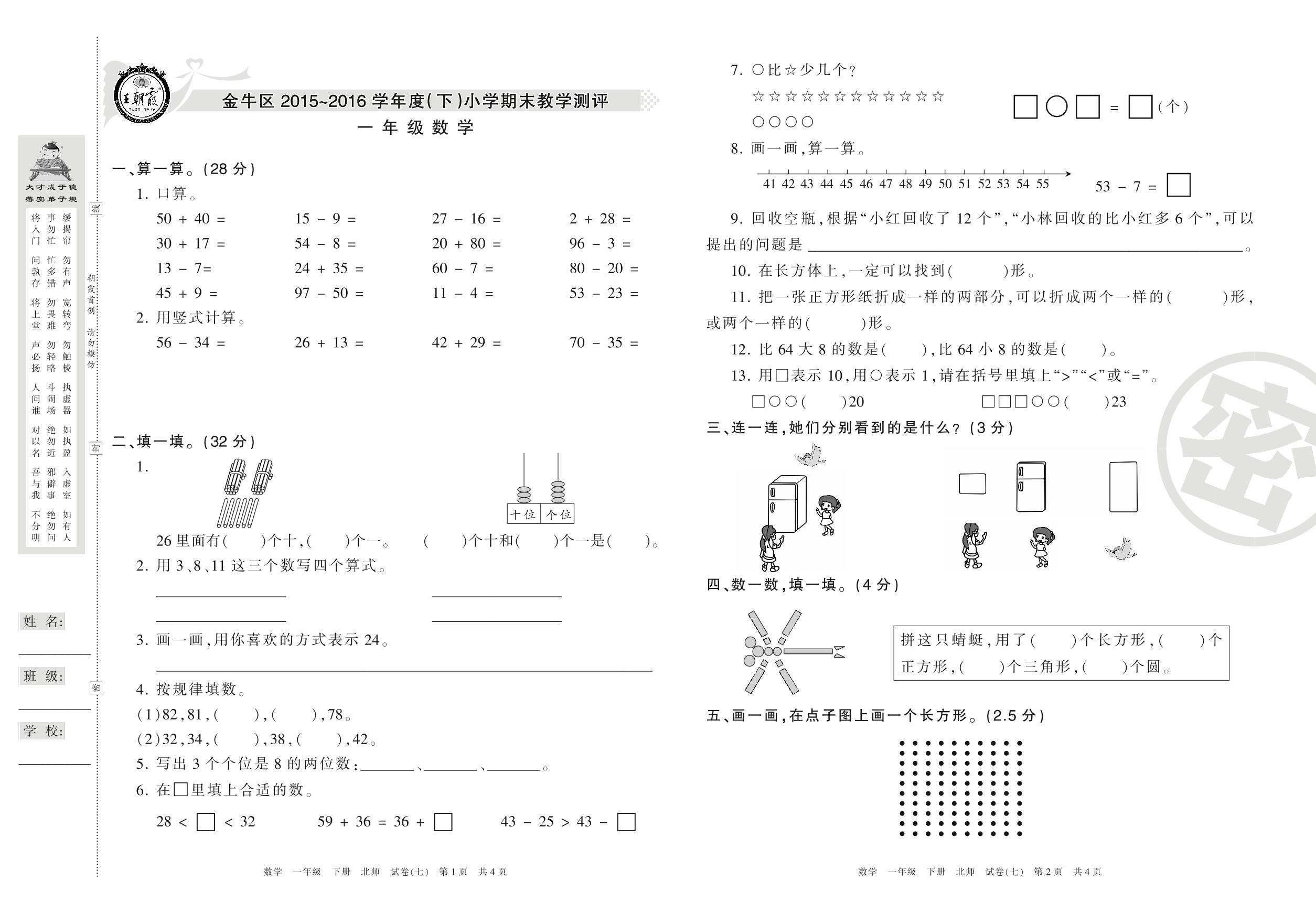 2015-2016学年第二学期成都市金牛区一年级数学试卷(北师版)【7】