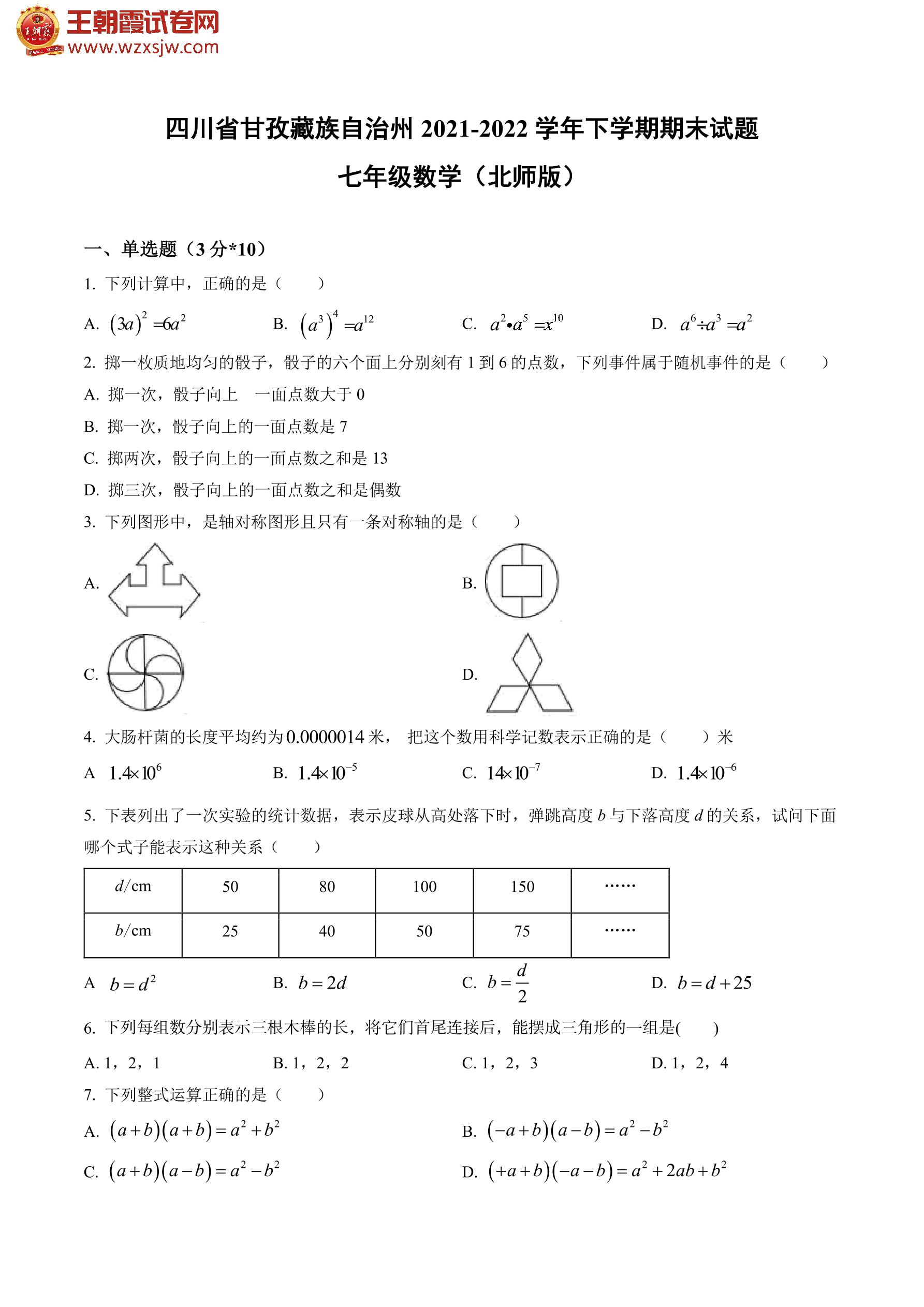 四川省甘孜藏族自治州2021-2022学年下学期期末试题七年级数学(北师版)
