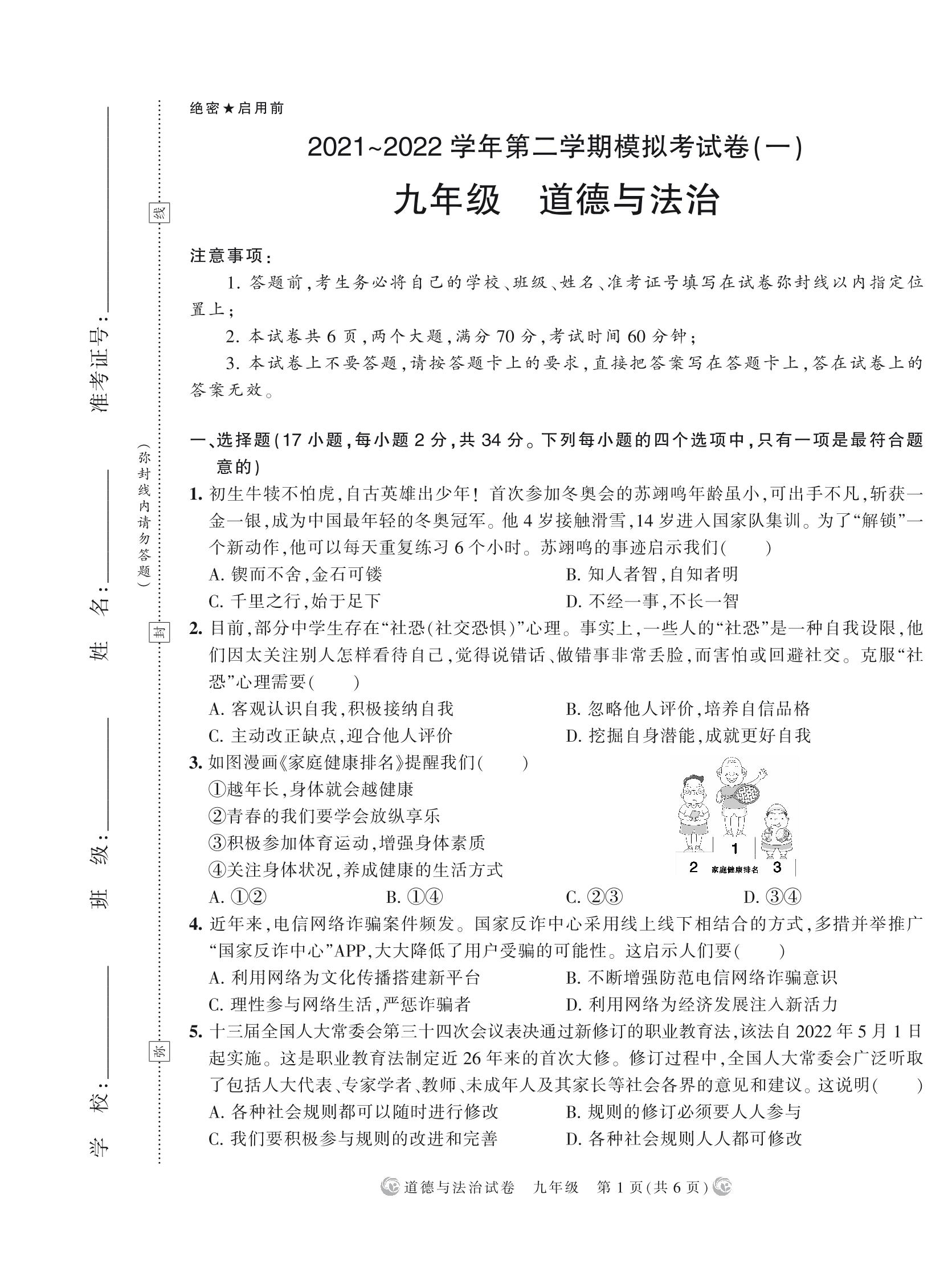 河南省安阳市林州市2021-2022学年第二学期模拟考试卷(一)九年级道德与法治(人教版)