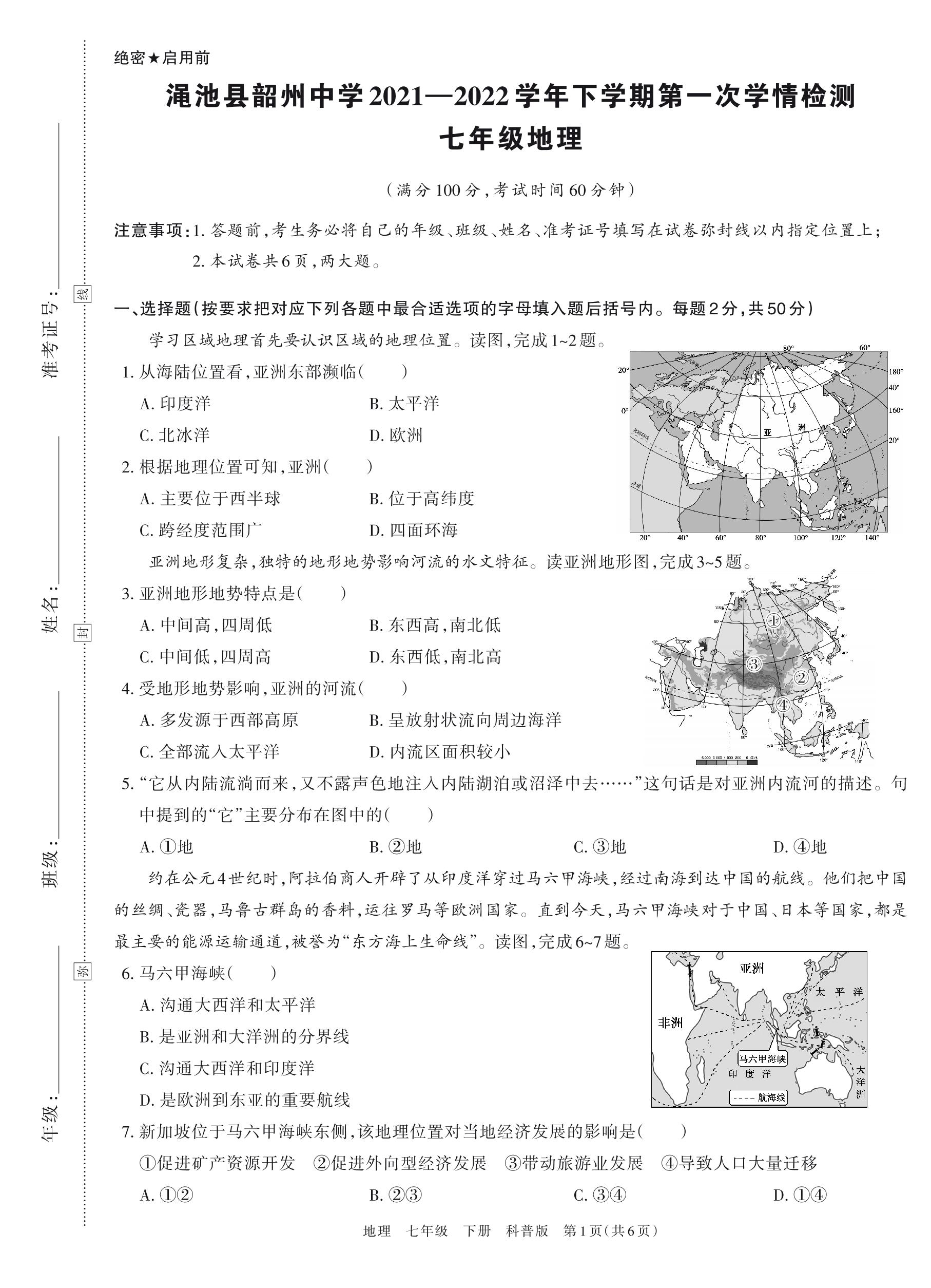 七年级地理科普版下册月考卷