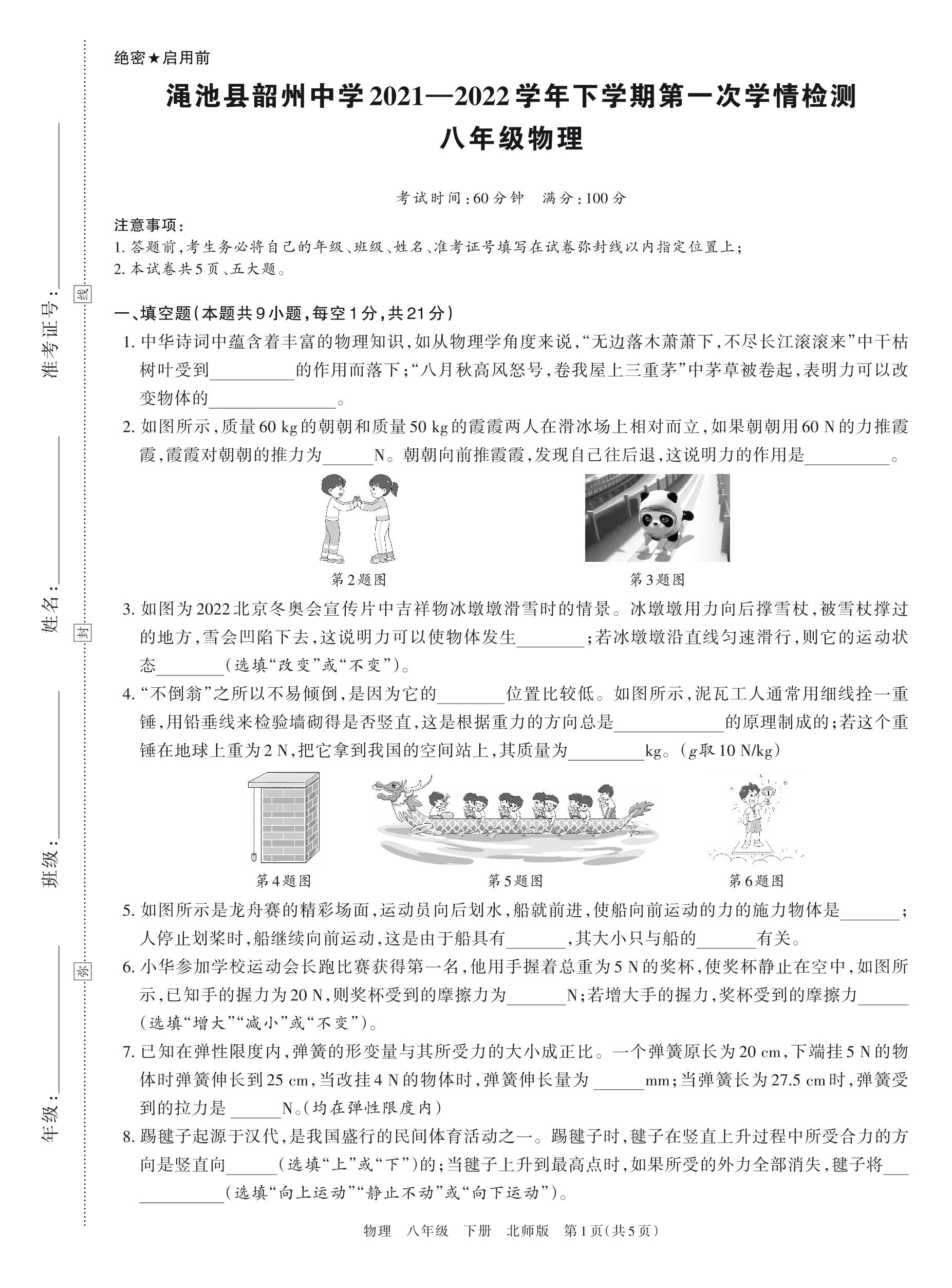 河南省三门峡市渑池县某中学2021-2022学年下学期第一次月考试卷八年级物理(北师版)