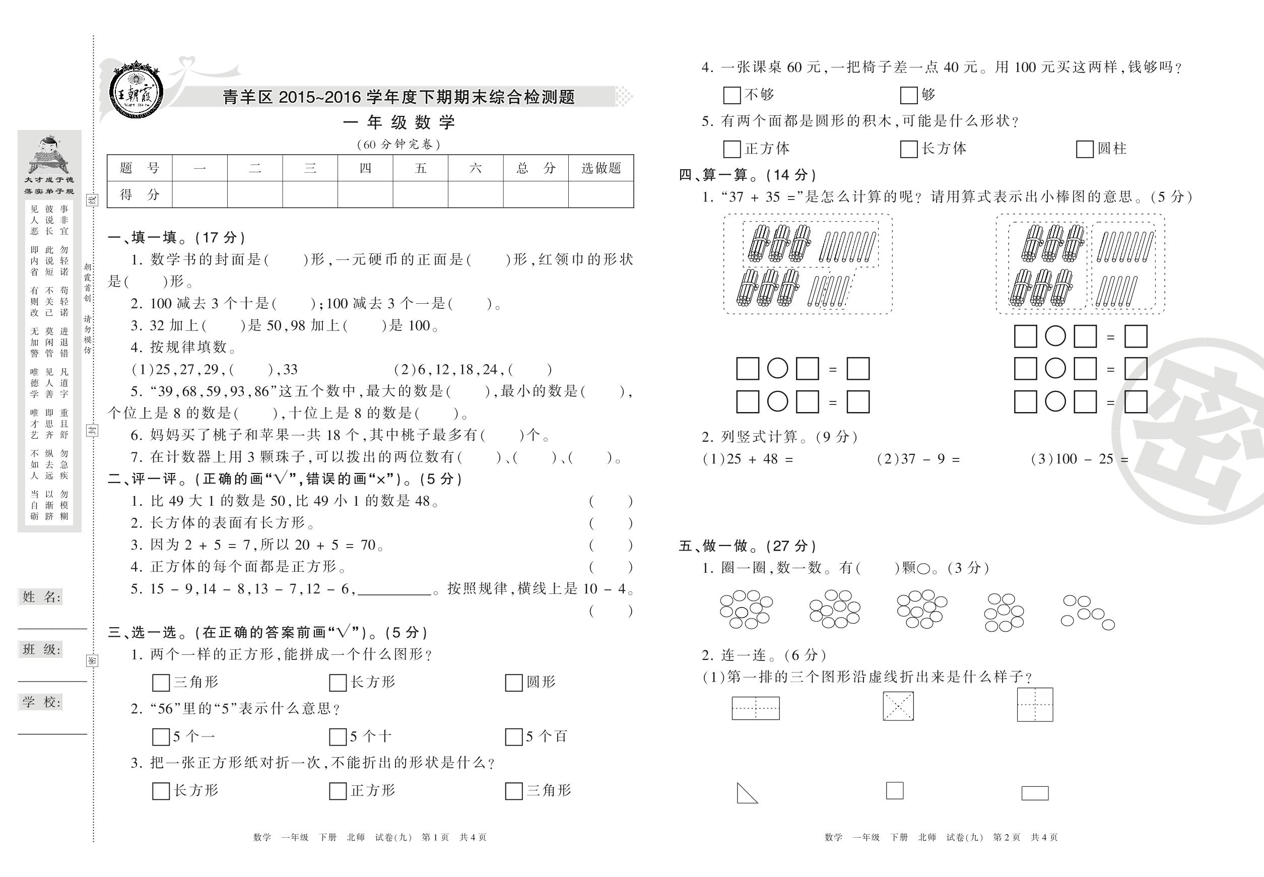 2015-2016学年第二学期成都市青羊区一年级数学试卷(北师版)【9】