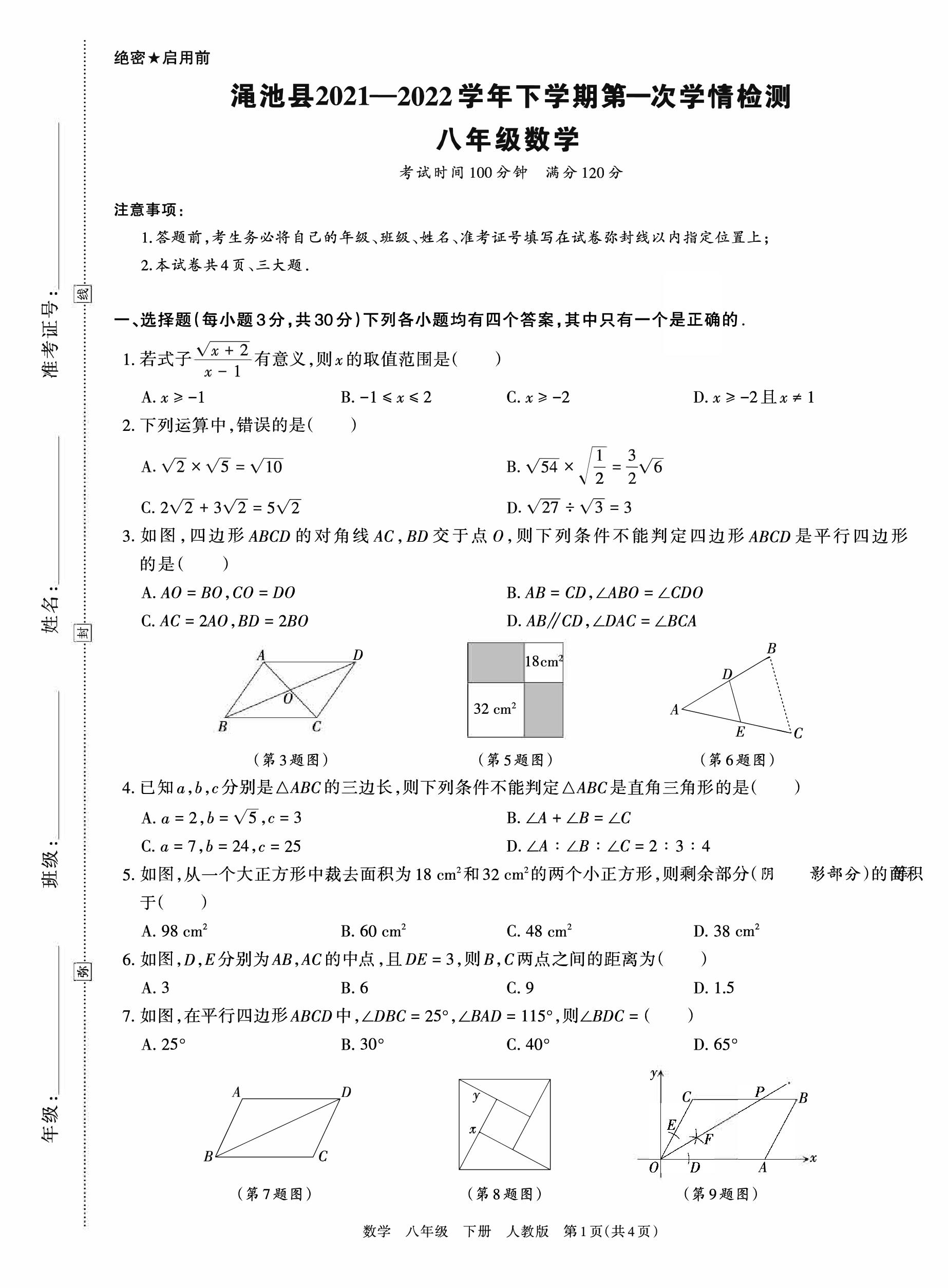 八年级数学人教版下册月考卷