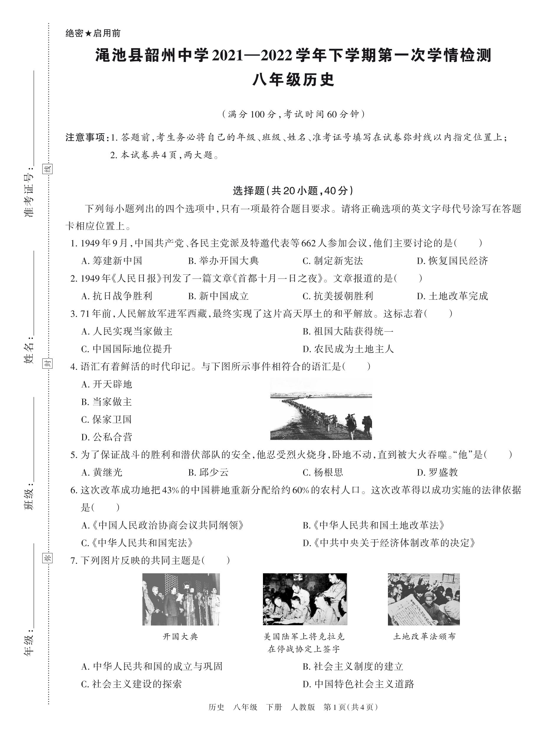 八年级历史人教版下册月考卷