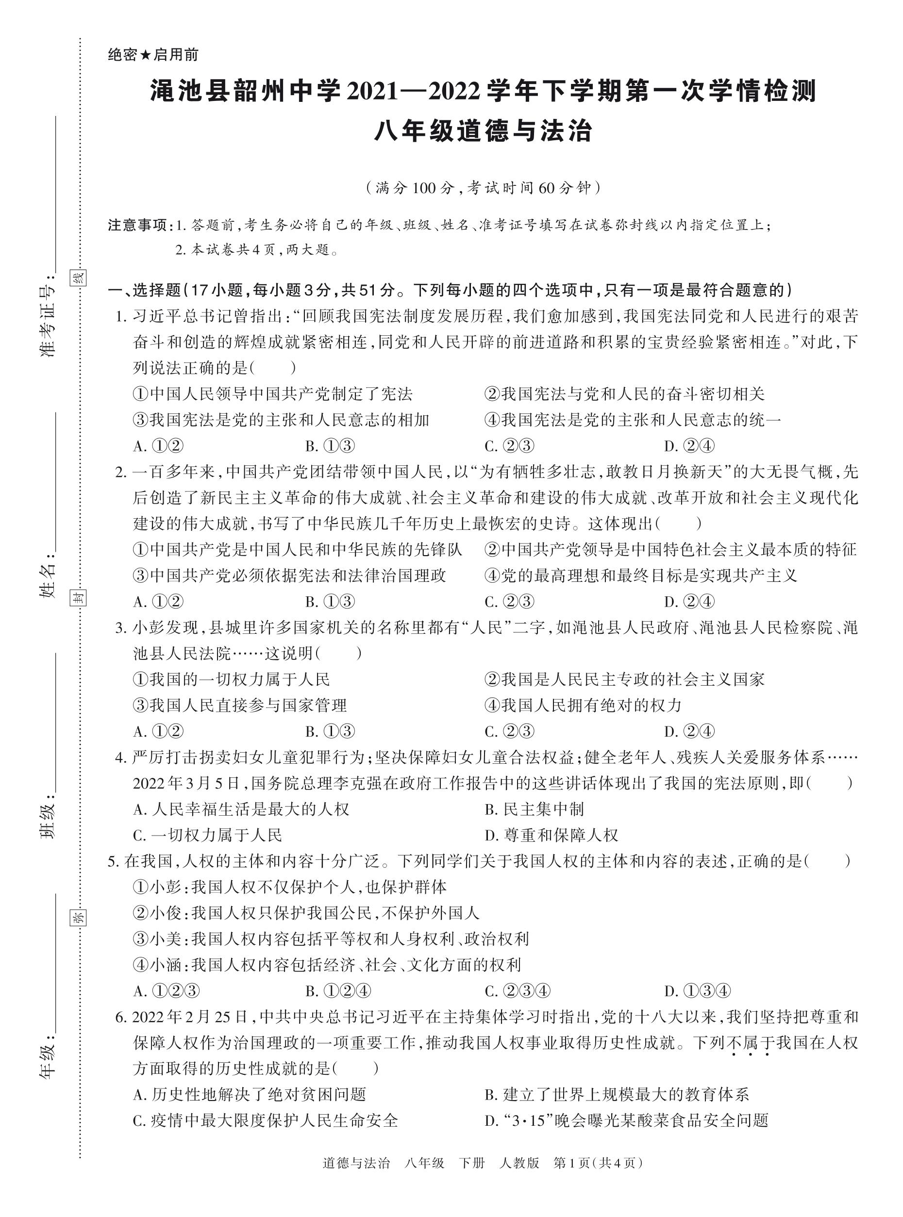 河南省三门峡市渑池县某中学2021-2022学年下学期第一次月考试卷八年级道德与法治(人教版)