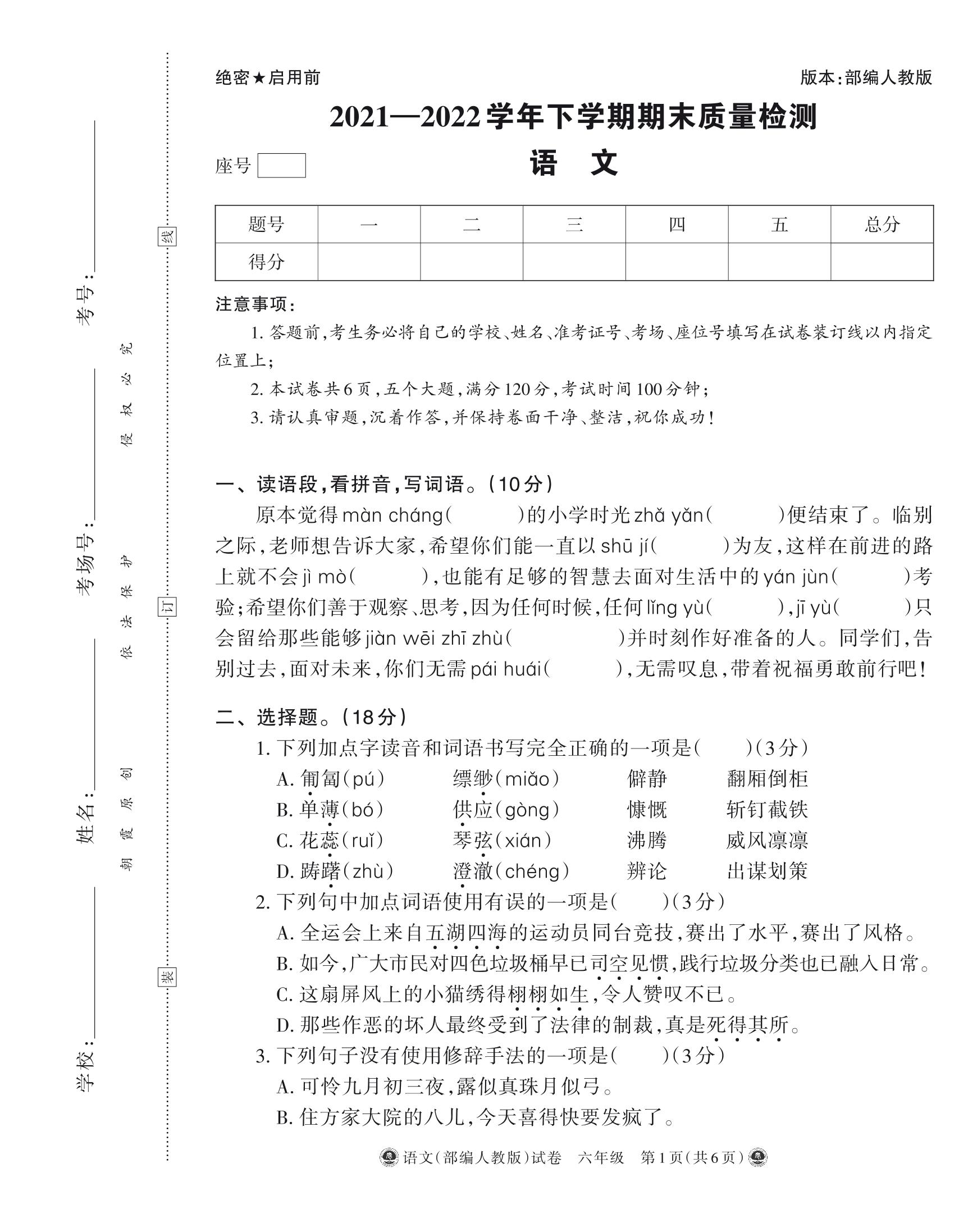 河南省焦作市孟州市2021-2022学年下学期期末质量检测六年级语文(人教版)