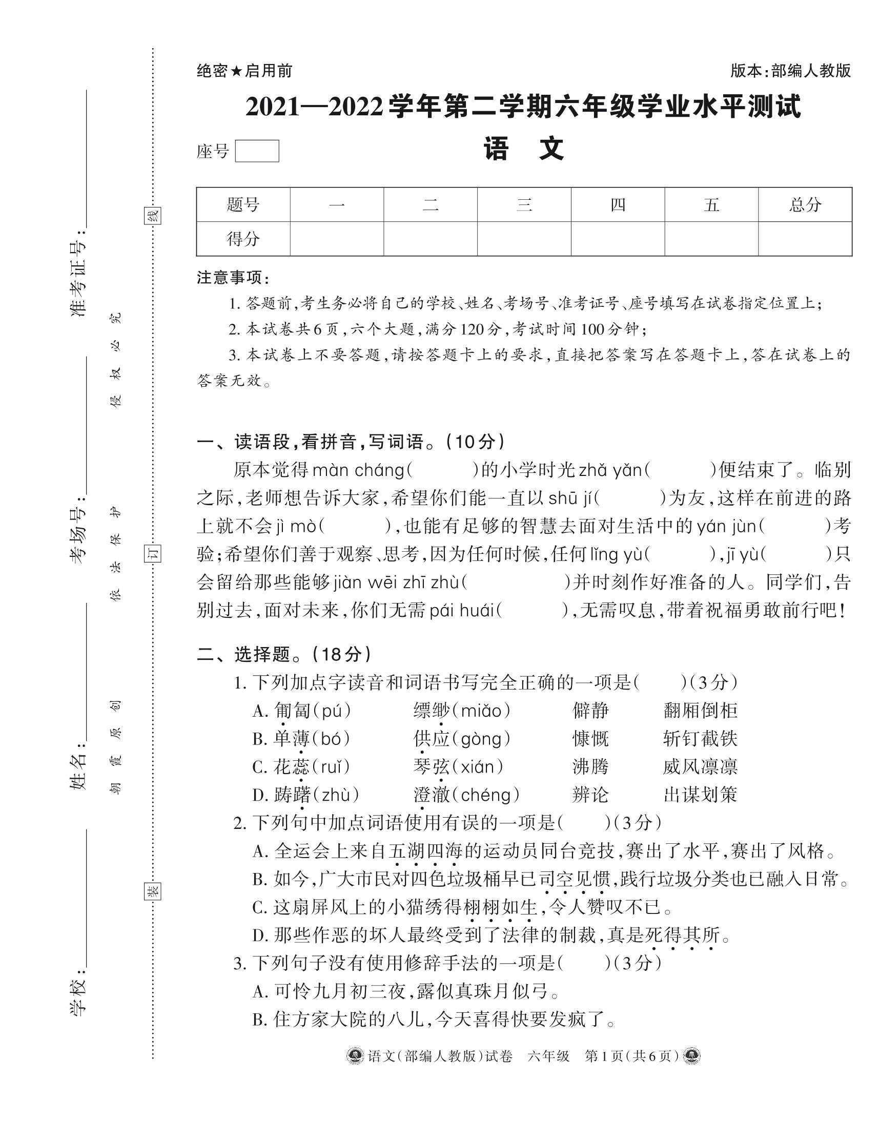 河南省安阳市汤阴县2021-2022学年第二学期学业水平测试卷六年级语文(人教版)