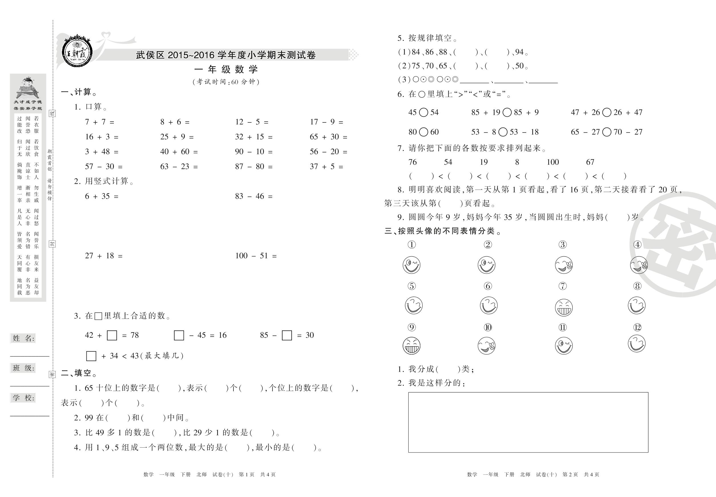 2015-2016学年第二学期成都市武侯区一年级数学试卷(北师版)【10】