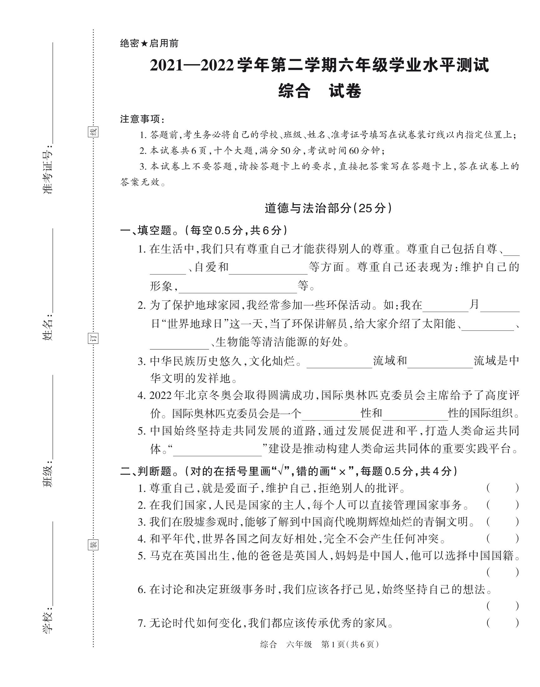 河南省安阳市汤阴县2022春小升初试卷六年级综合