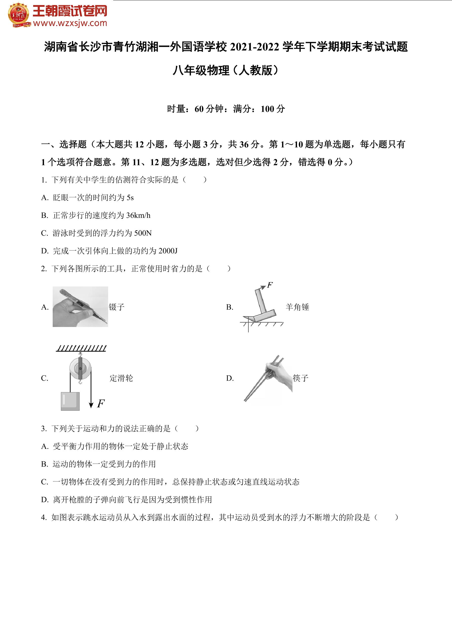 湖南省长沙市青竹湖湘一外国语学校2021-2022学年下学期期末考试试题八年级物理(人教版)
