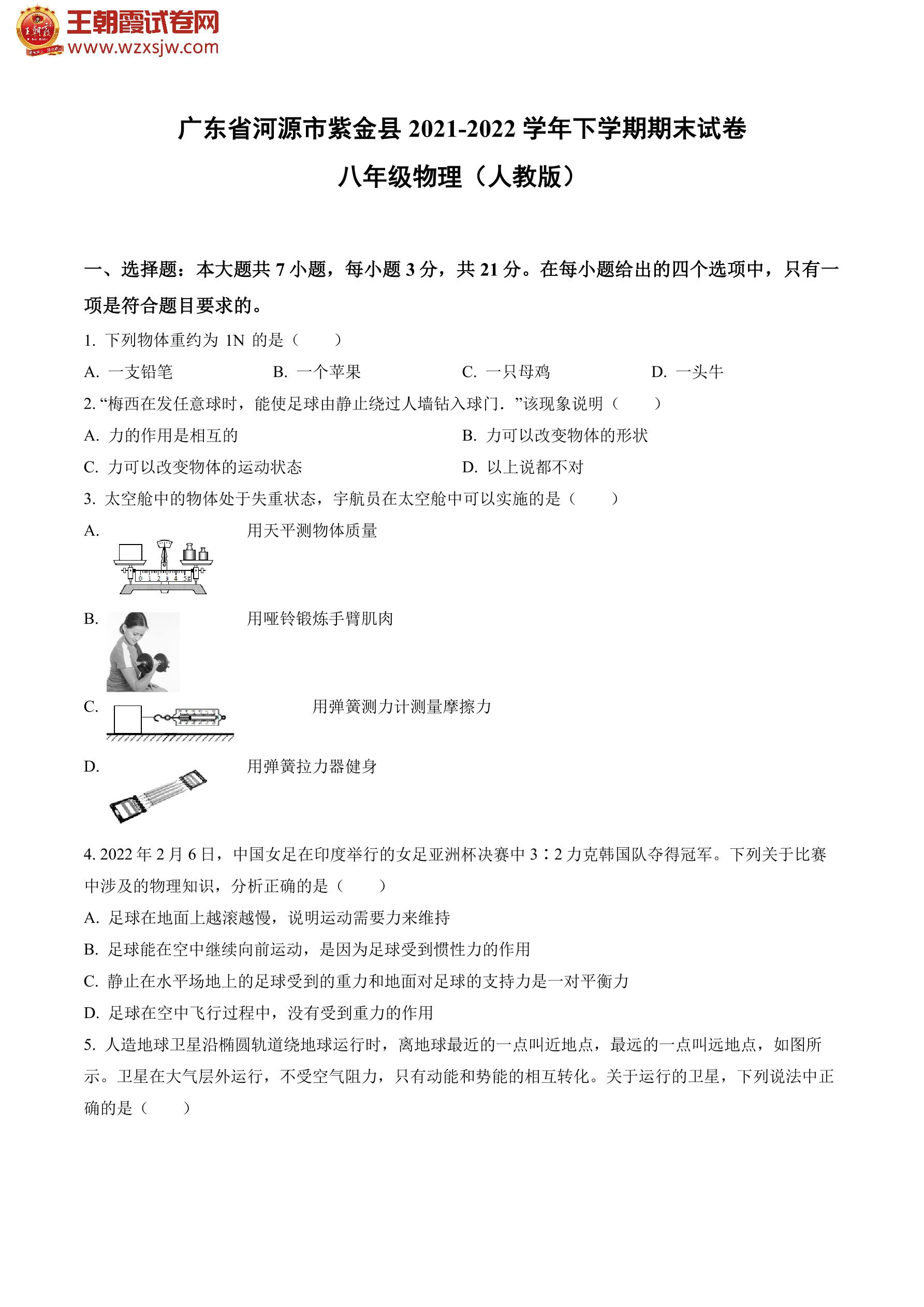 广东省河源市紫金县2021-2022学年下学期期末试卷八年级物理(人教版)