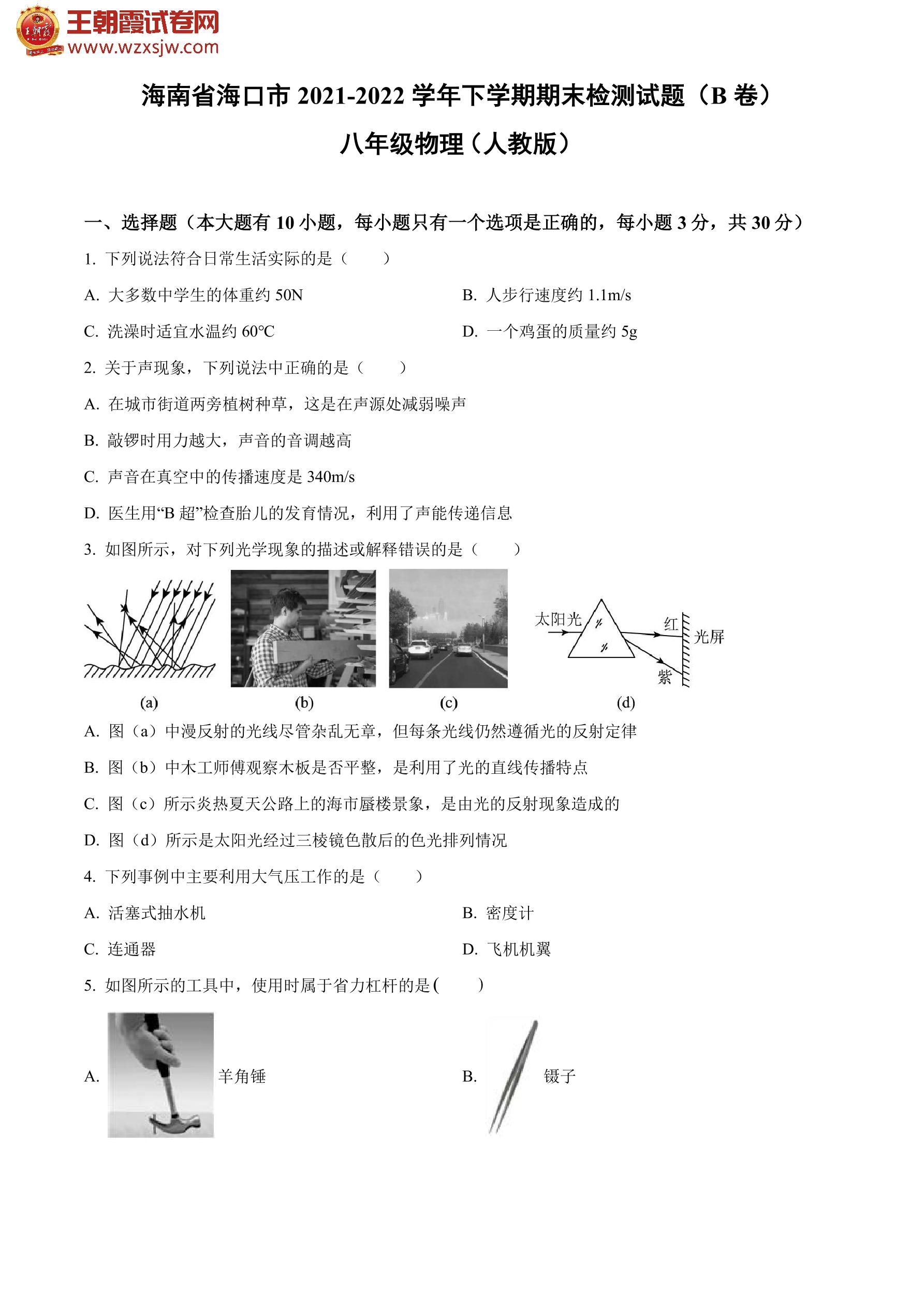 海南省海口市2021-2022学年下学期期末检测试题(B卷)八年级物理(人教版)