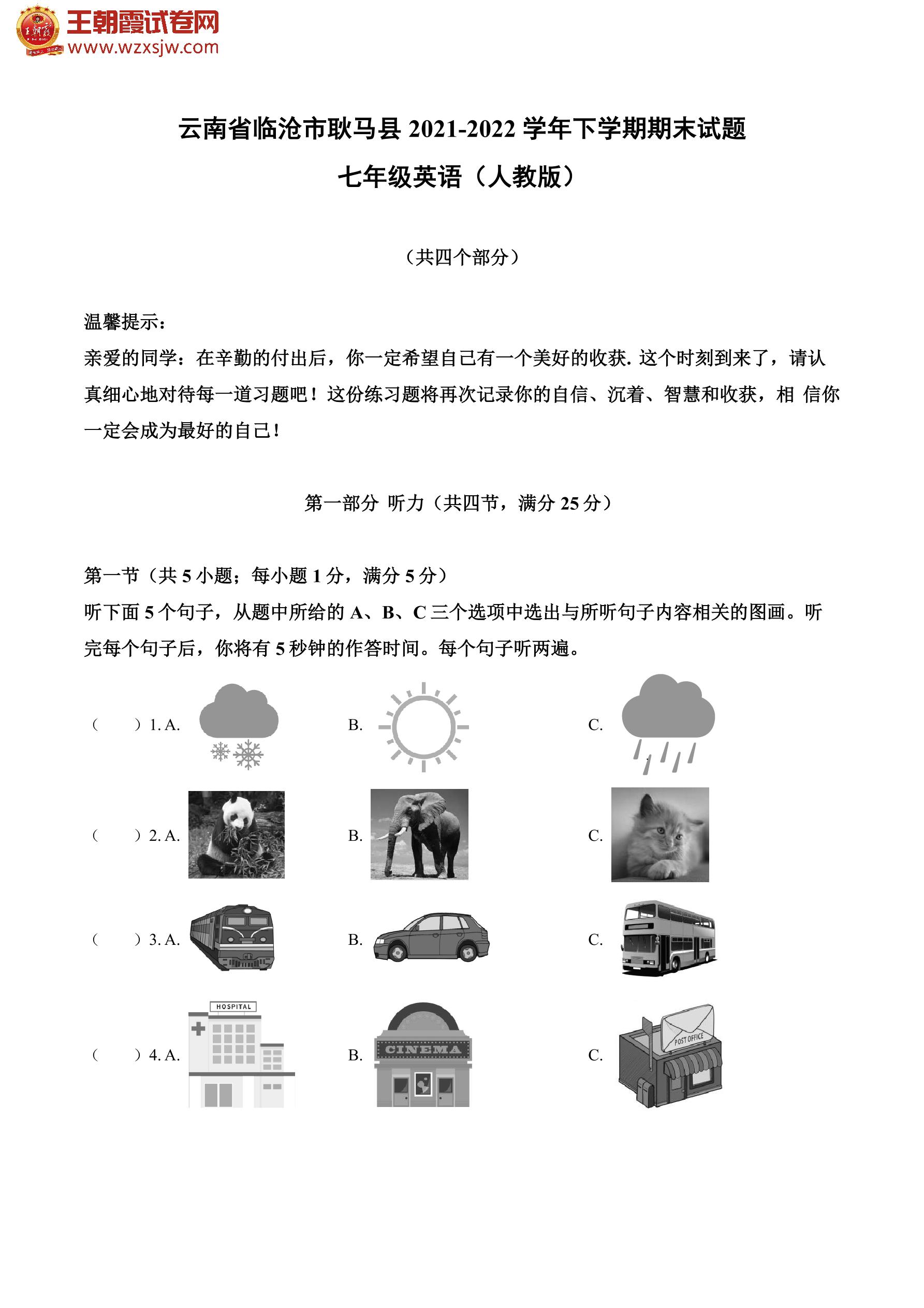 云南省临沧市耿马县2021-2022学年下学期期末试题七年级英语(人教版)【无听力音频】