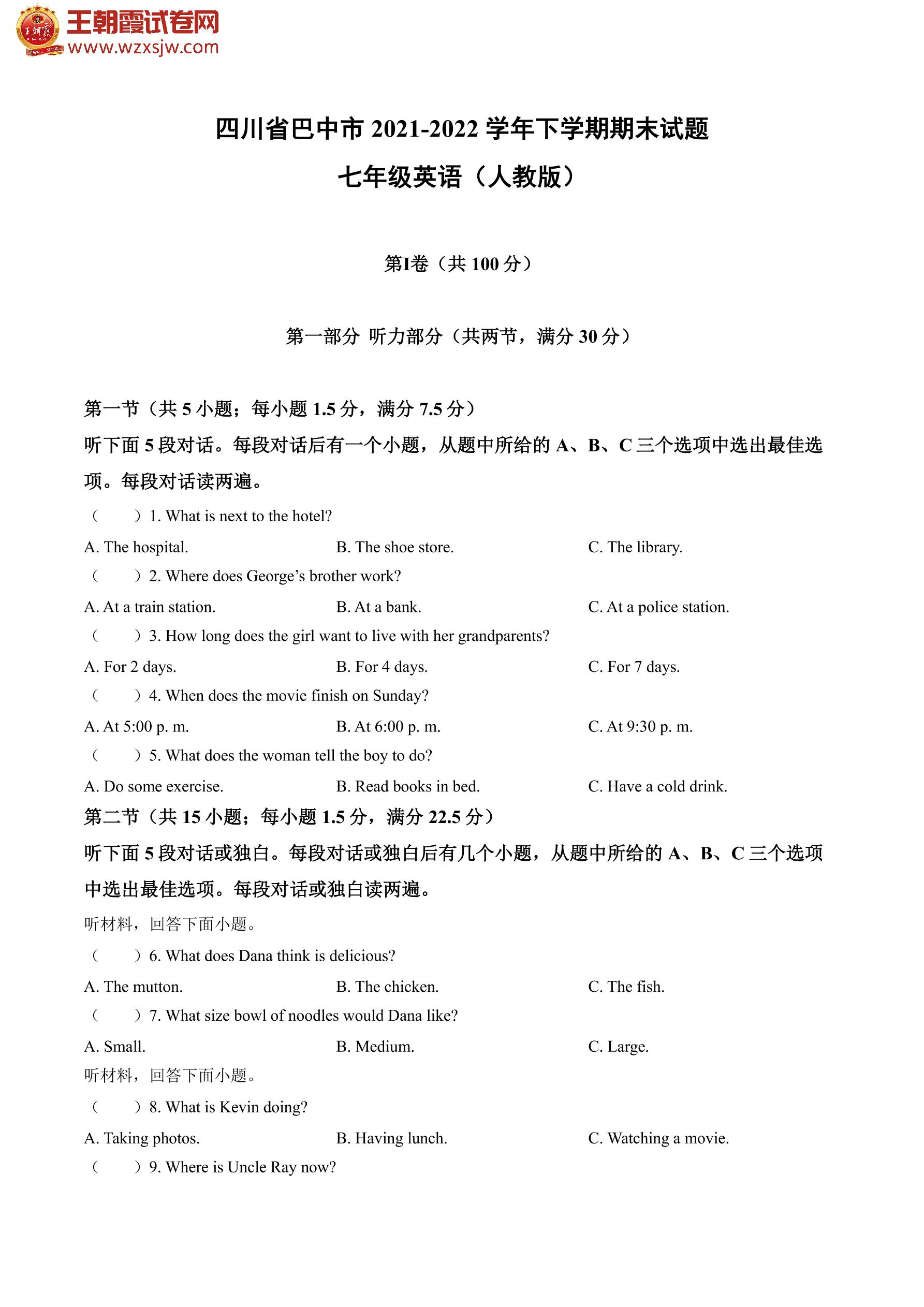 四川省巴中市2021-2022学年下学期期末试题七年级英语(人教版)【无听力音频】