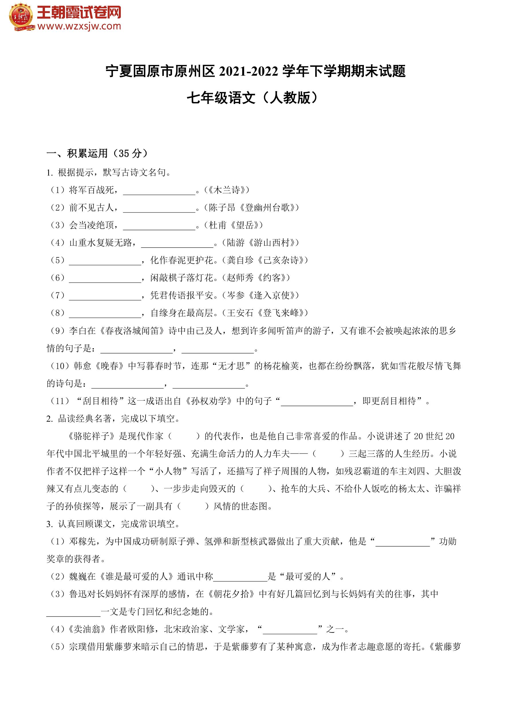 宁夏固原市原州区2021-2022学年下学期期末试题七年级语文(人教版)