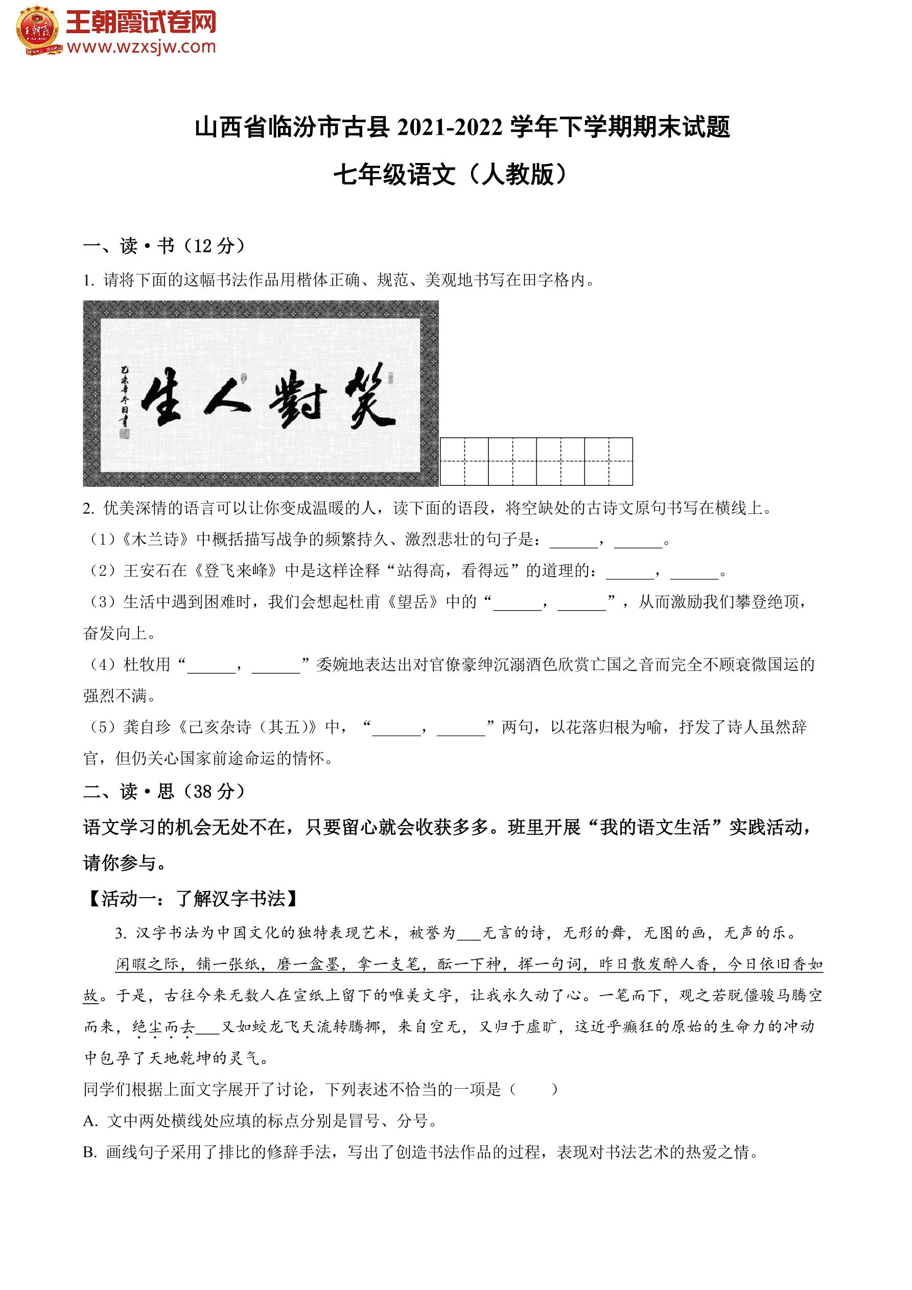 山西省临汾市古县2021-2022学年下学期期末试题七年级语文(人教版)