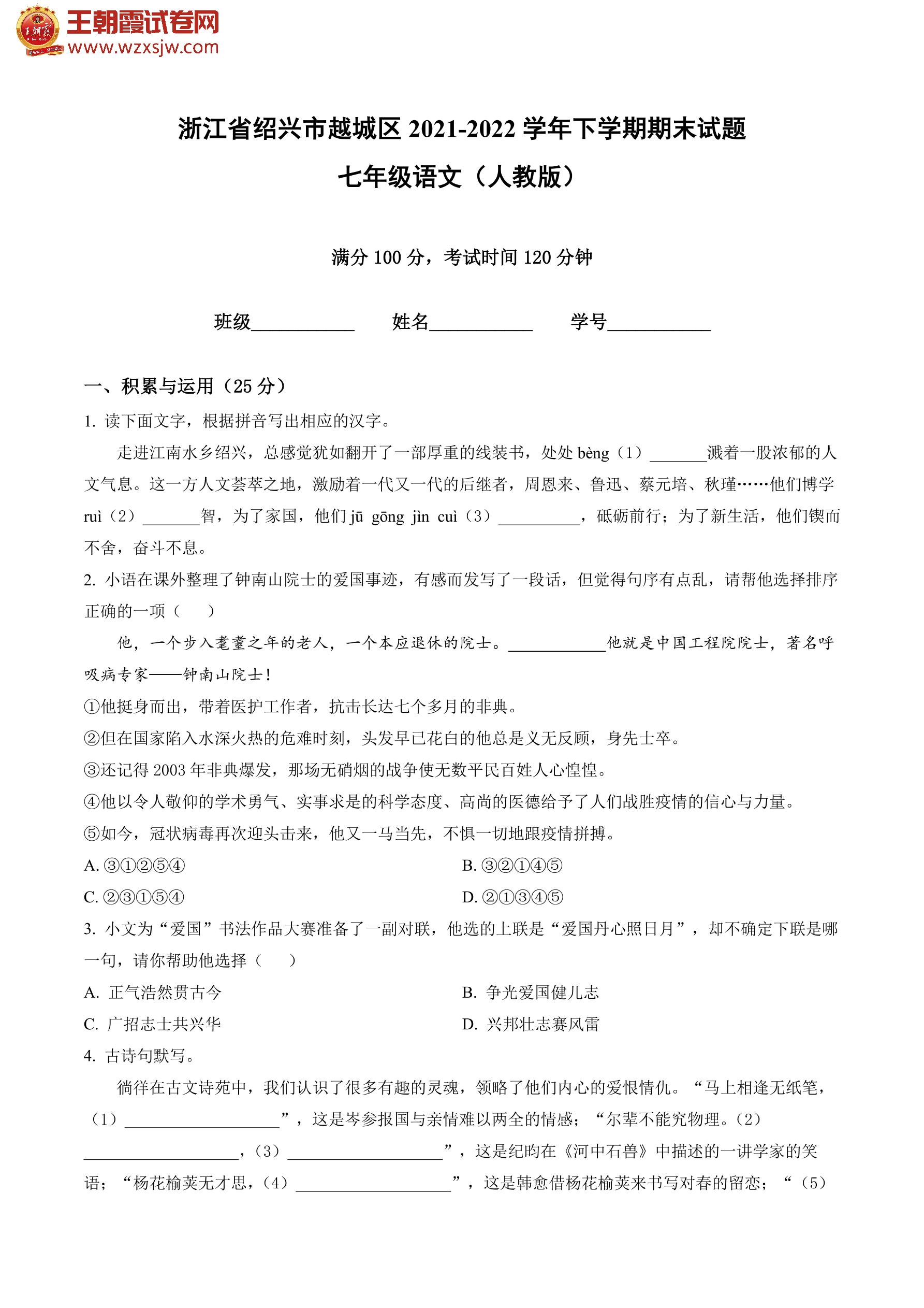 浙江省绍兴市越城区2021-2022学年下学期期末试题七年级语文(人教版)