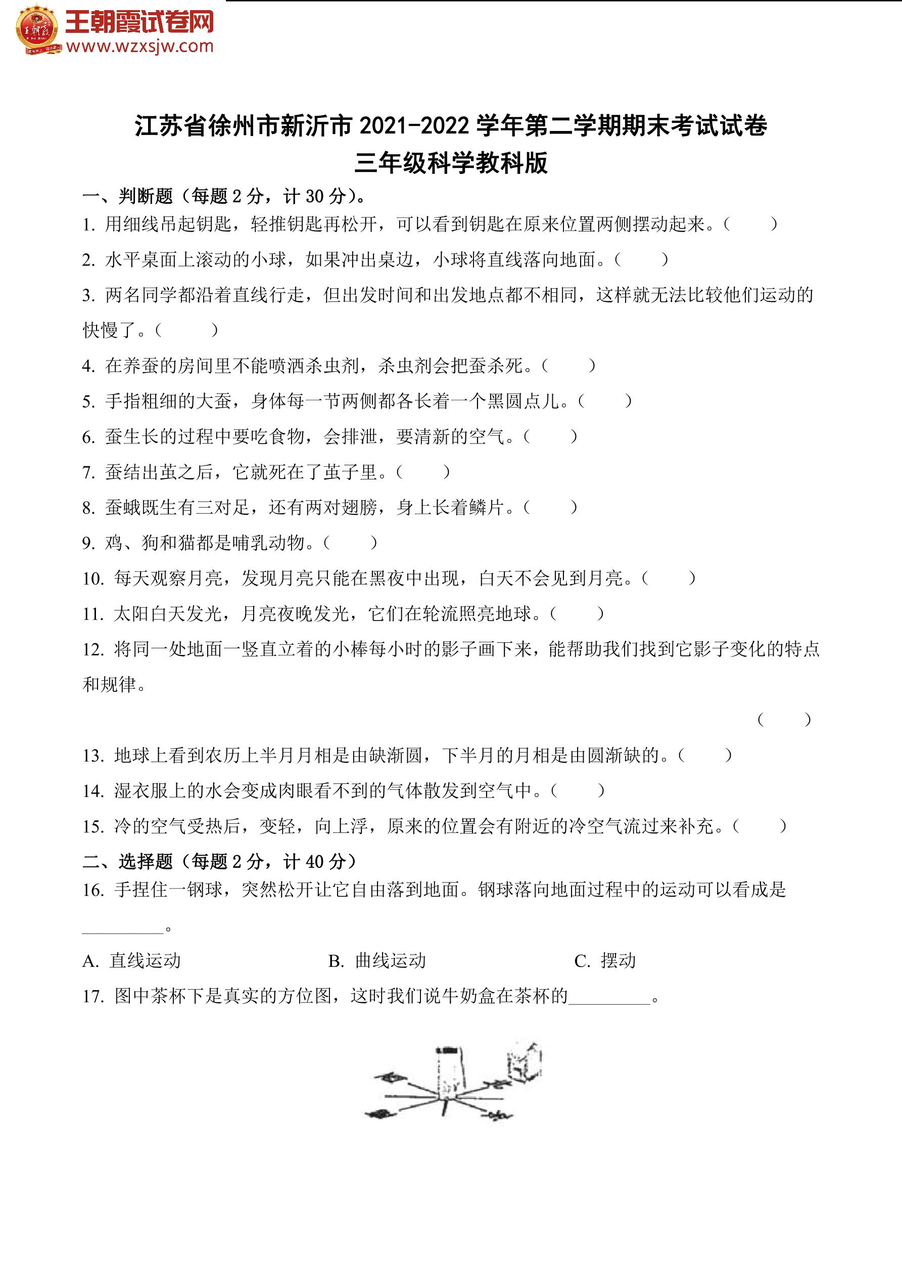 江苏省徐州市新沂市2021-2022学年第二学期期末考试试卷三年级科学(教科版)
