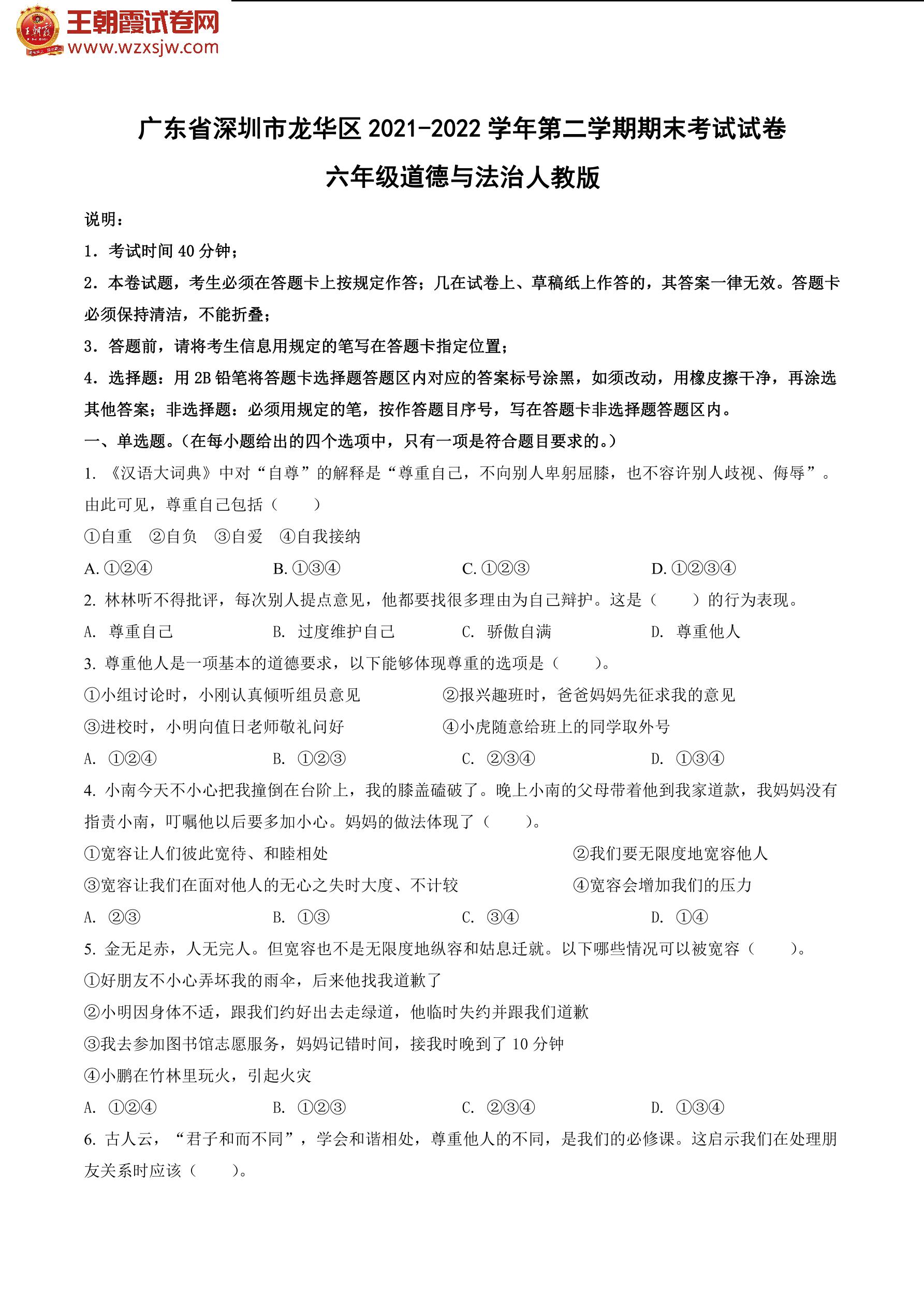广东省深圳市龙华区2021-2022学年第二学期期末考试道德与法治试卷六年级人教版