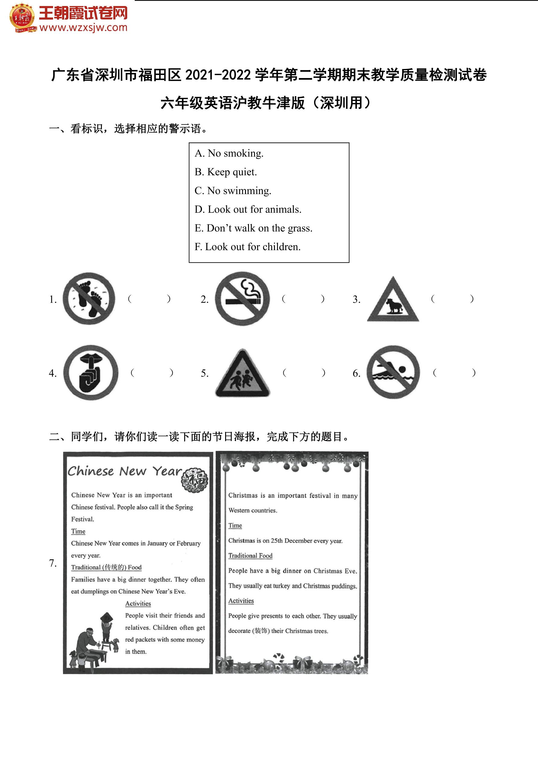 广东省深圳市福田区2021-2022学年第二学期期末教学质量检测试卷六年级英语(沪教牛津版)【无听力音频】