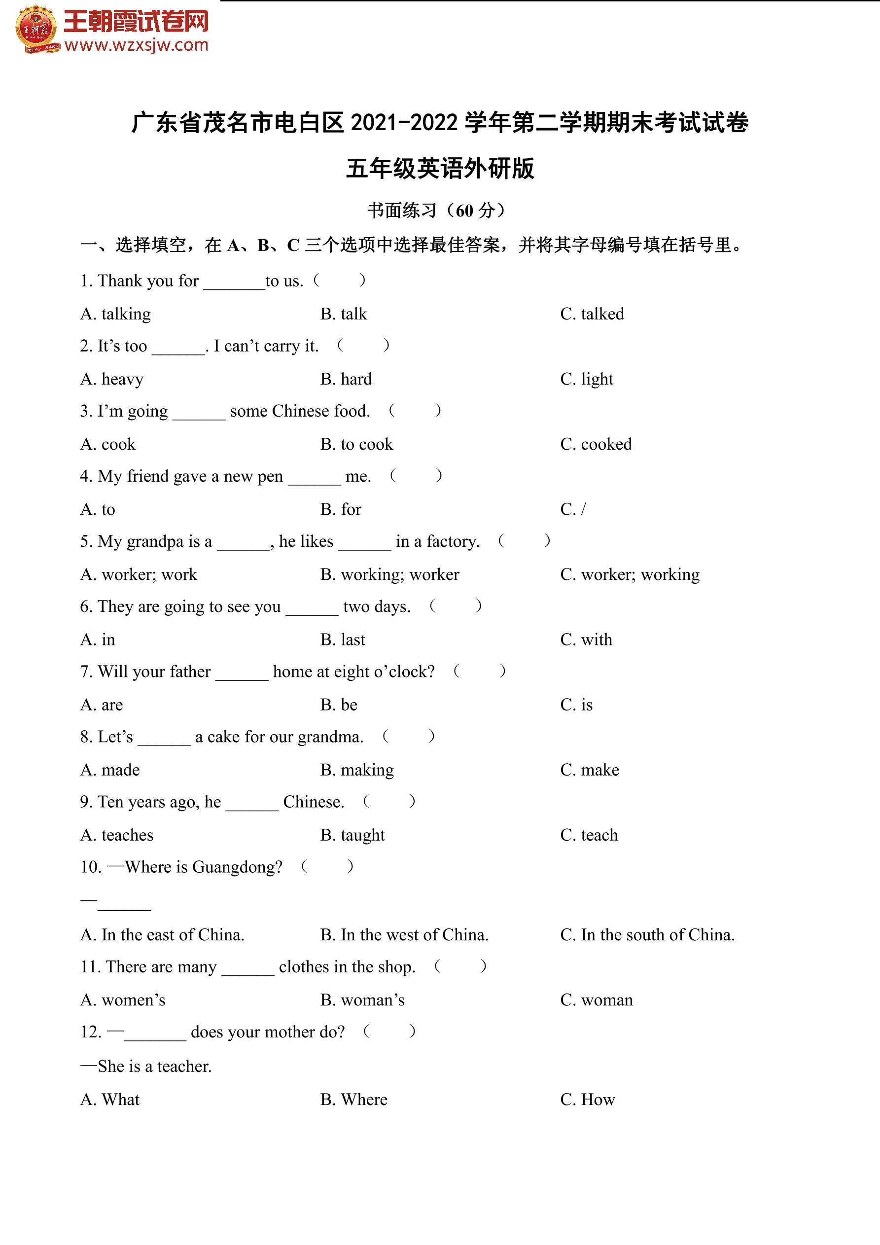 广东省茂名市电白区2021-2022学年第二学期期末考试试卷五年级英语(外研版)【无听力音频】