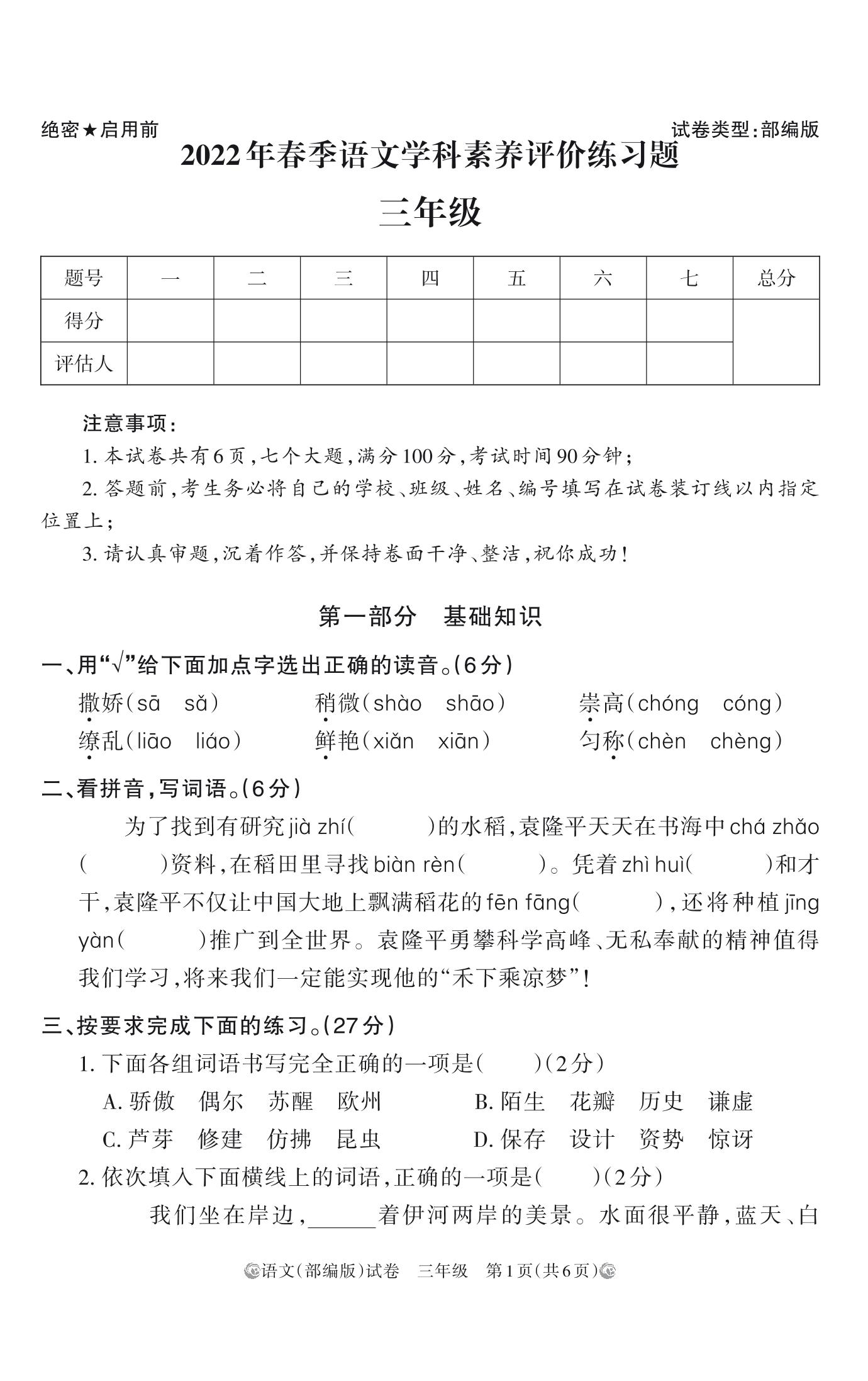 河南省洛阳市栾川县2022年春季学科素养评价期中练习题三年级语文(人教版)