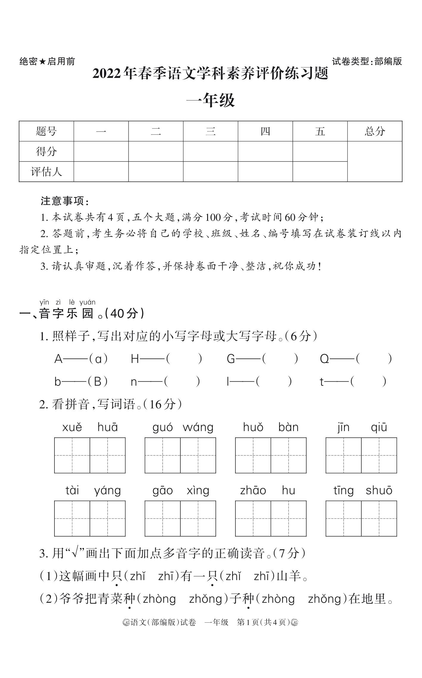 河南省洛阳市栾川县2022年春季学科素养评价期中练习题一年级语文(人教版)