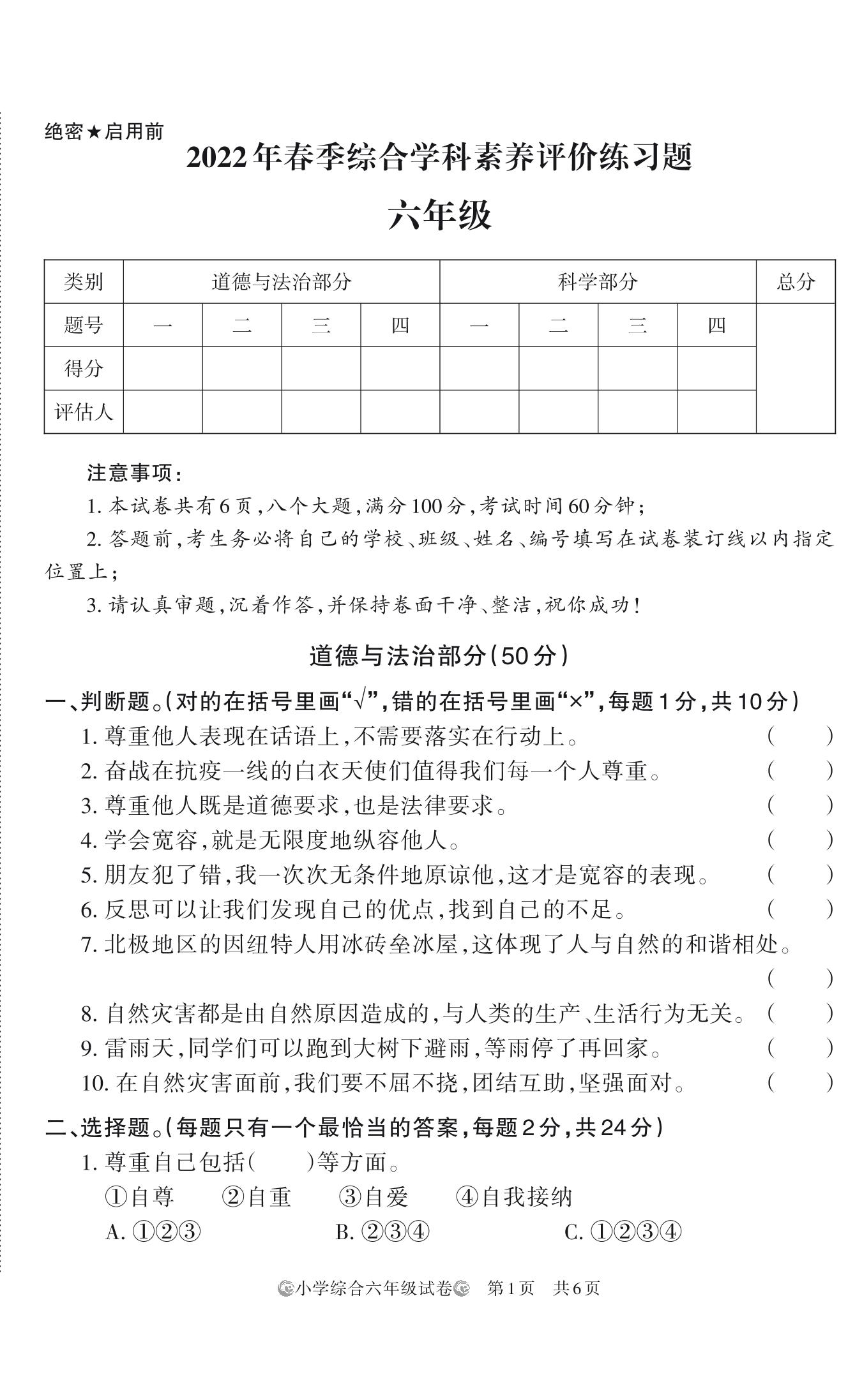 河南省洛阳市栾川县2022年春季学科素养评价期中练习题六年级道德与法治、科学
