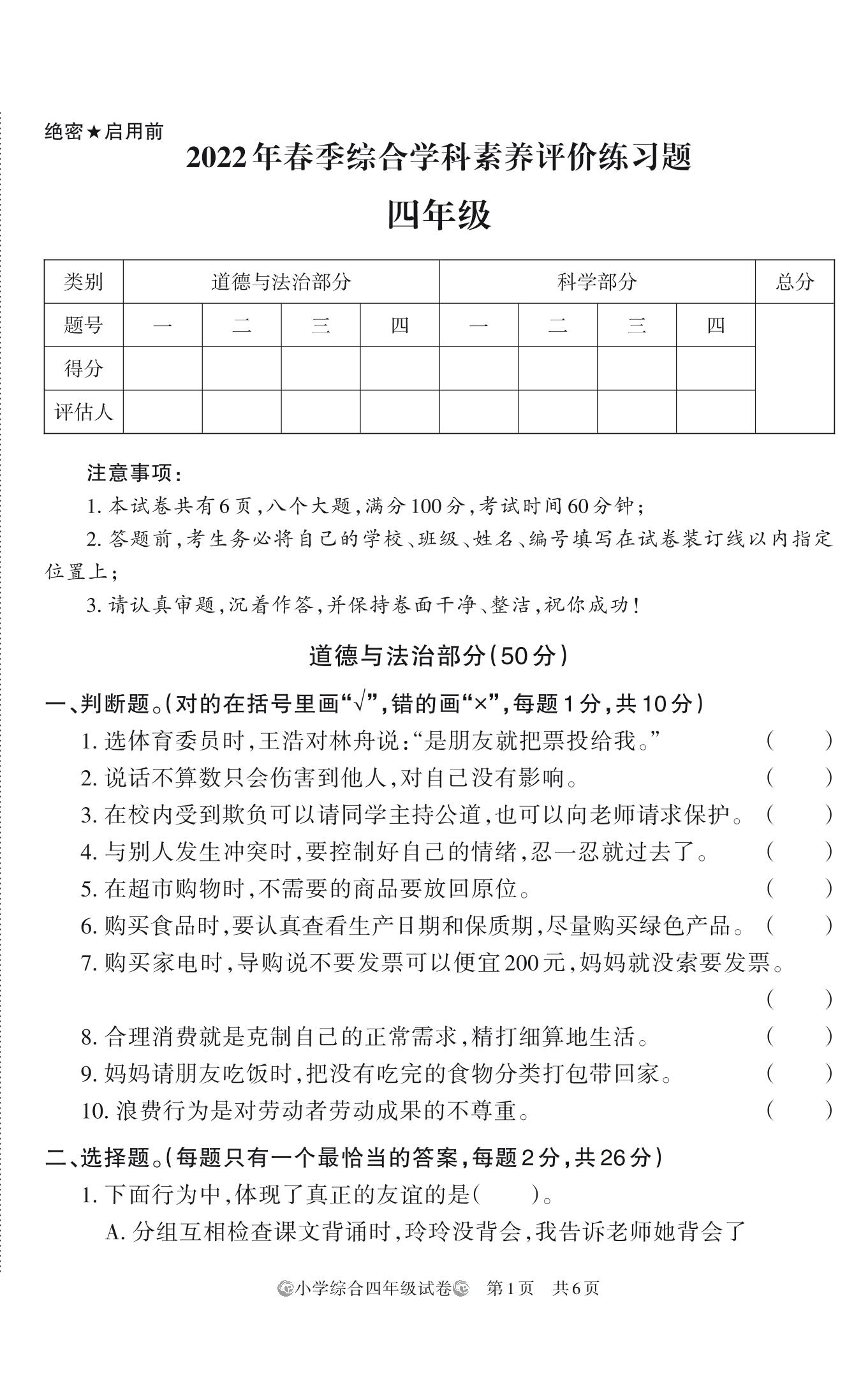 河南省洛阳市栾川县2022年春季学科素养评价期中练习题四年级道德与法治、科学