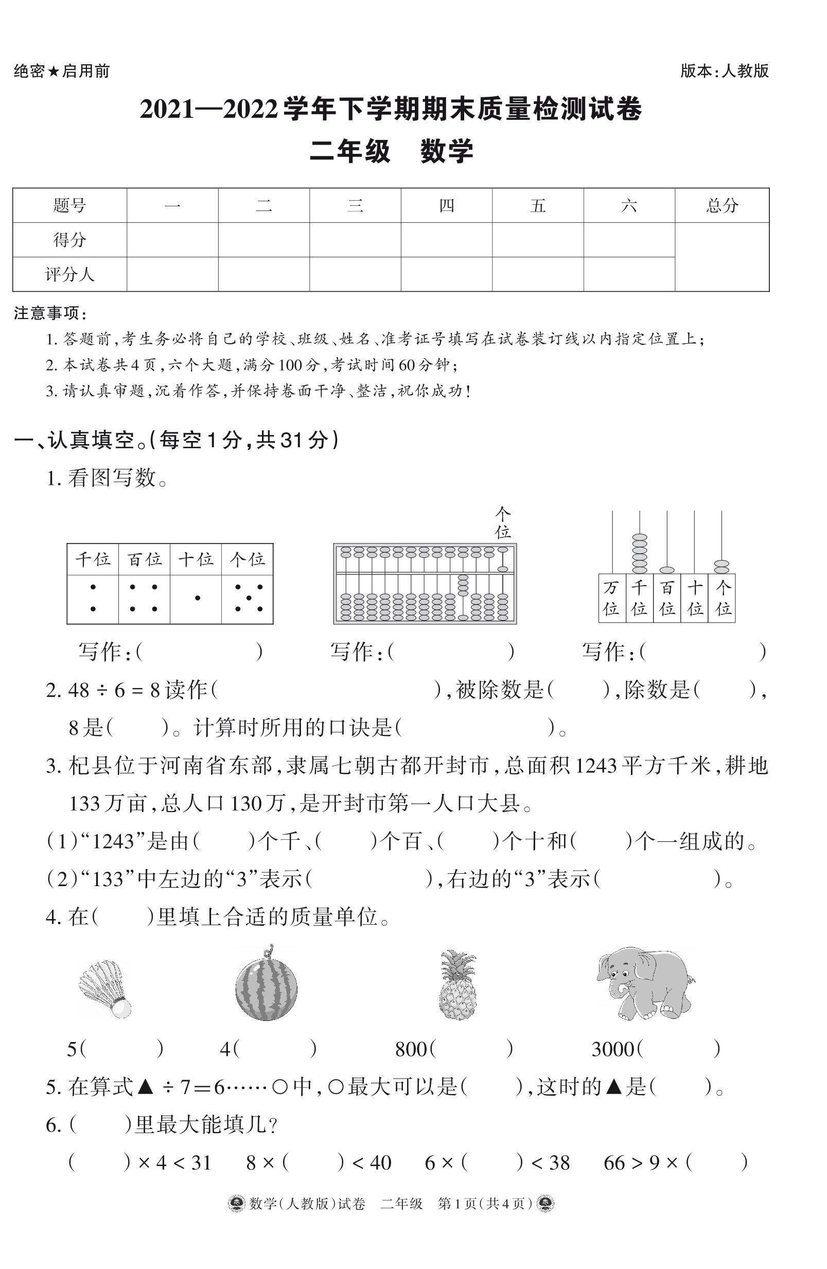 河南省开封市杞县2021-2022学年下学期期末试卷二年级数学(人教版)