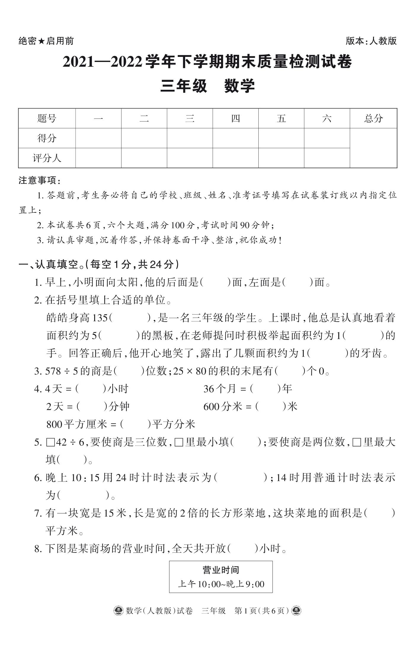 河南省开封市杞县2021-2022学年下学期期末试卷三年级数学(人教版)