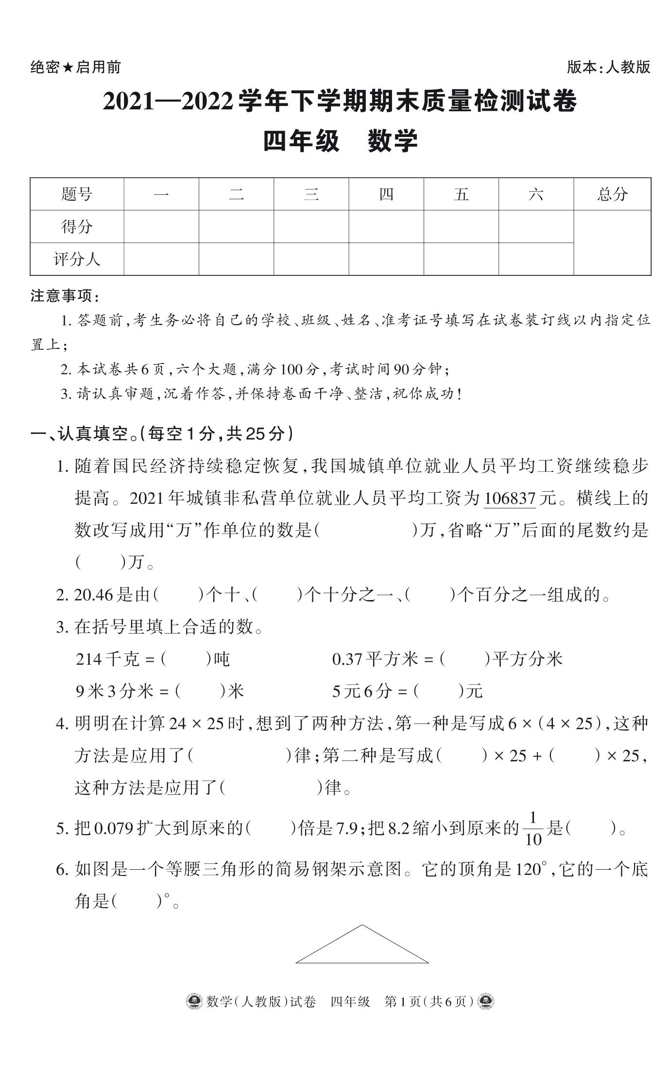 河南省开封市杞县2021-2022学年下学期期末试卷四年级数学(人教版)