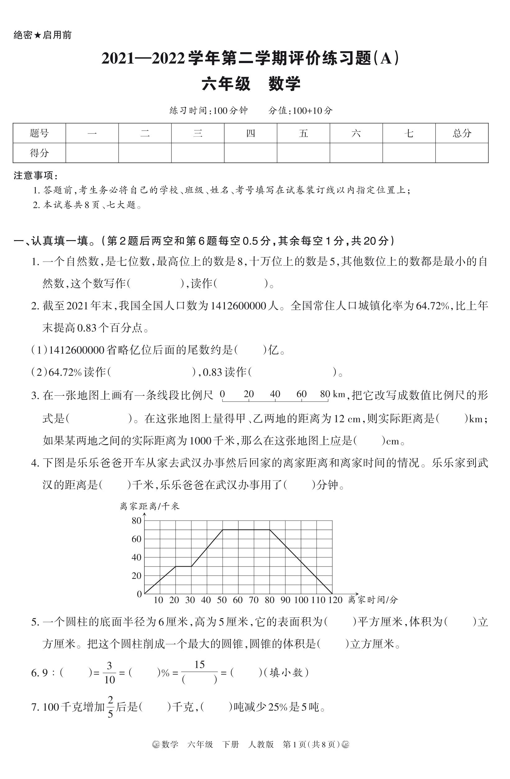 湖北省武汉市某校2021-2022学年第二学期小升初试卷(A卷)六年级数学(人教版)