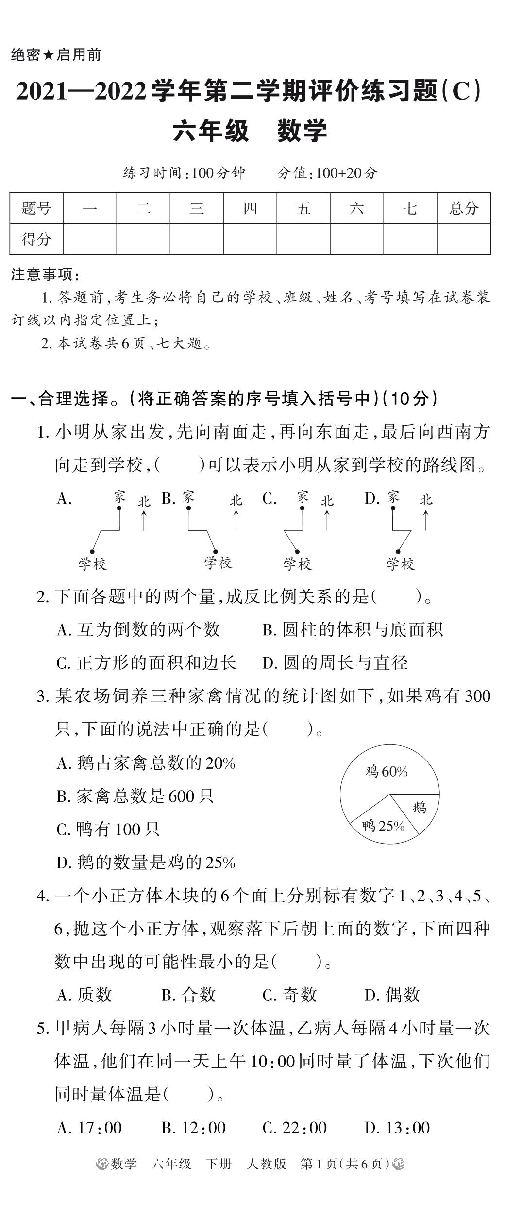 湖北省武汉市某校2021-2022学年第二学期小升初试卷(C卷)六年级数学(人教版)