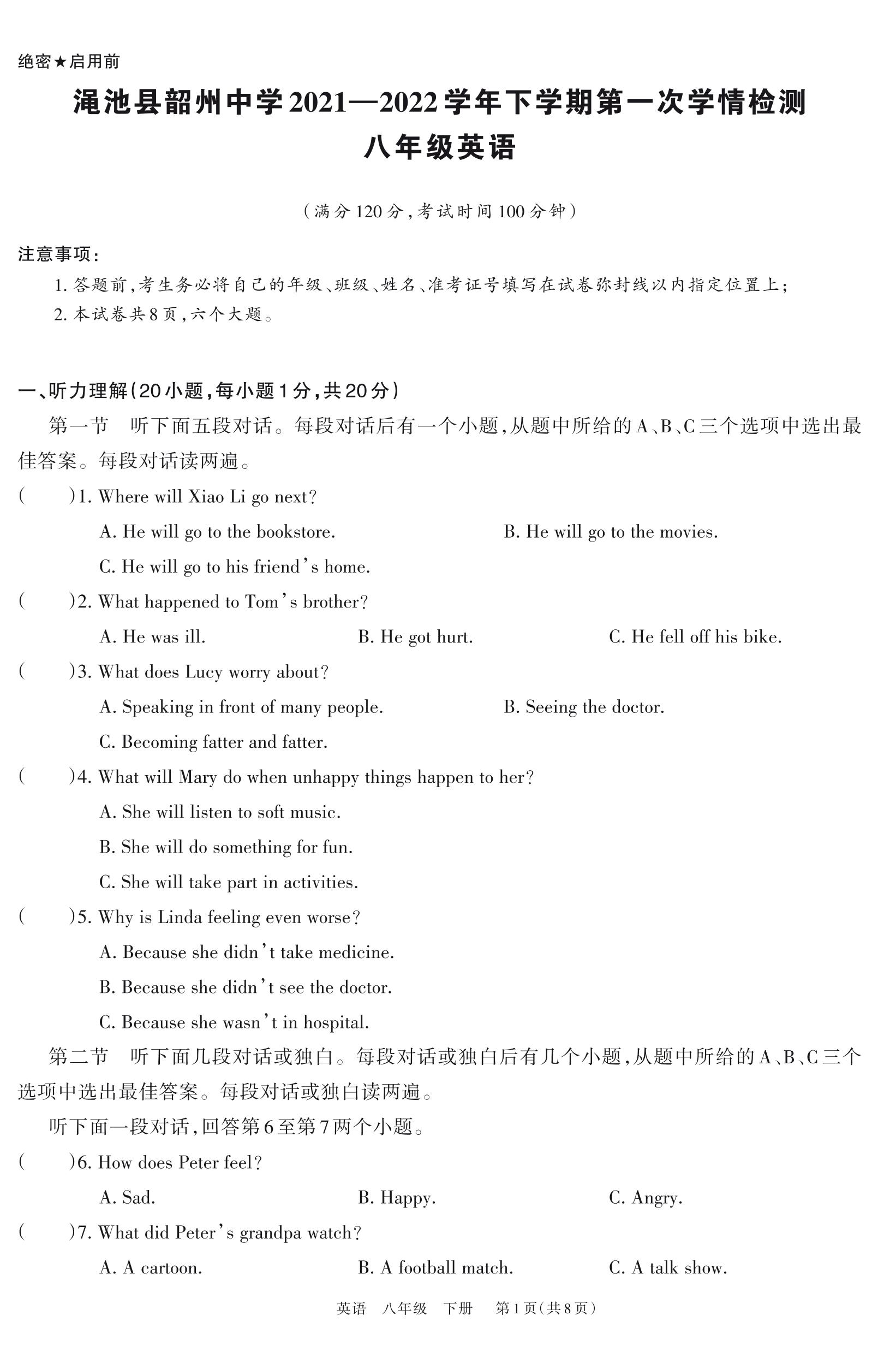 河南省三门峡市渑池县某中学2021-2022学年下学期第一次月考试卷八年级英语(新课标)