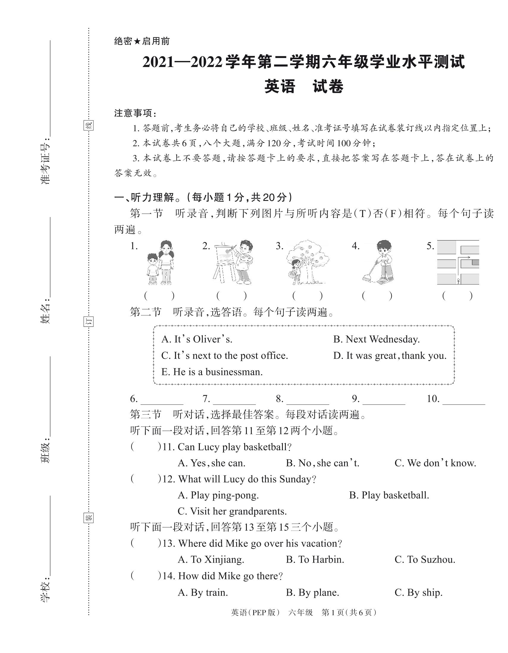 河南省安阳市汤阴县2022春小升初试卷六年级英语(PEP版)