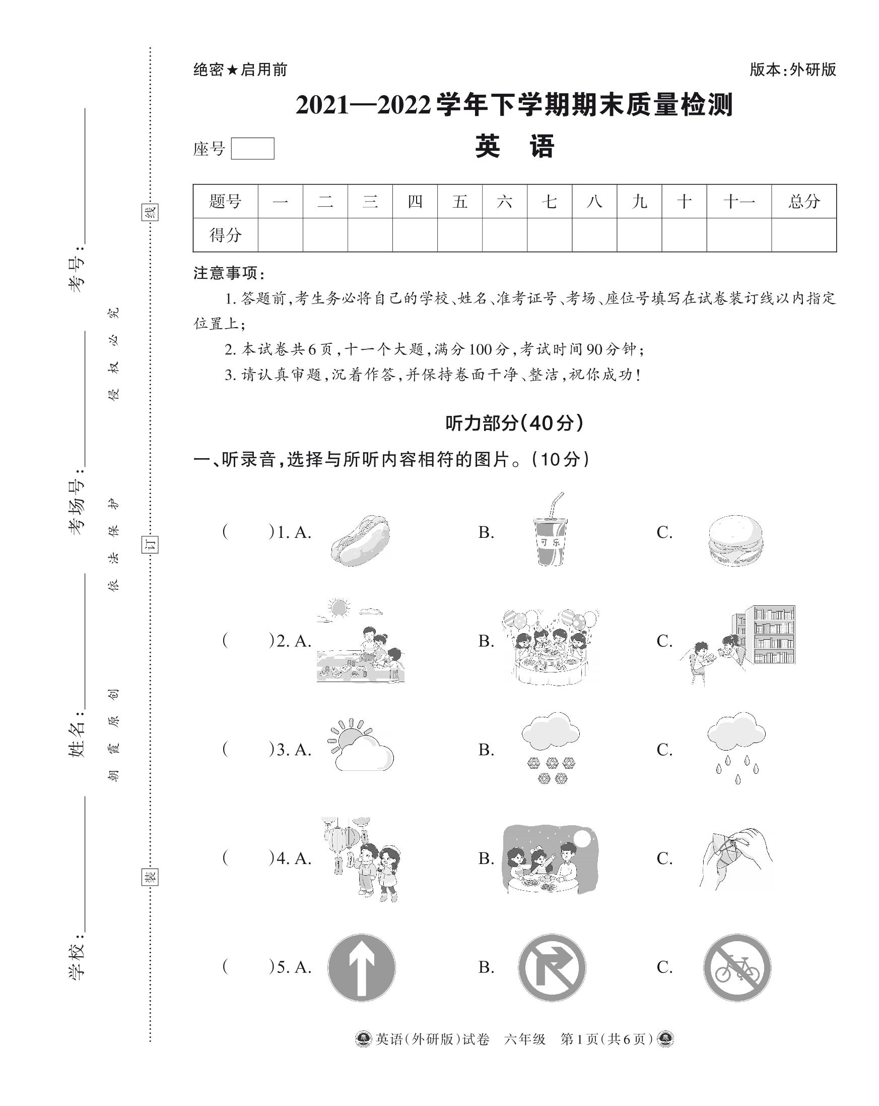 河南省焦作市孟州市2021-2022学年下学期期末质量检测六年级英语(外研版)