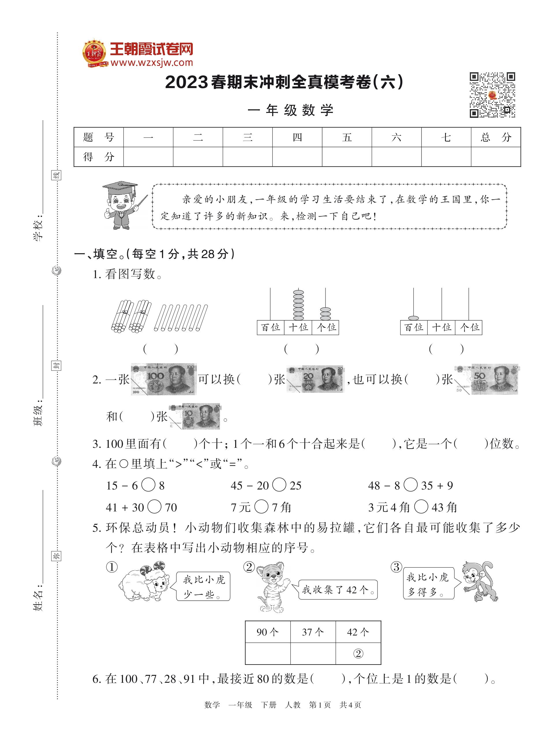 一年级数学人教版下册期末卷