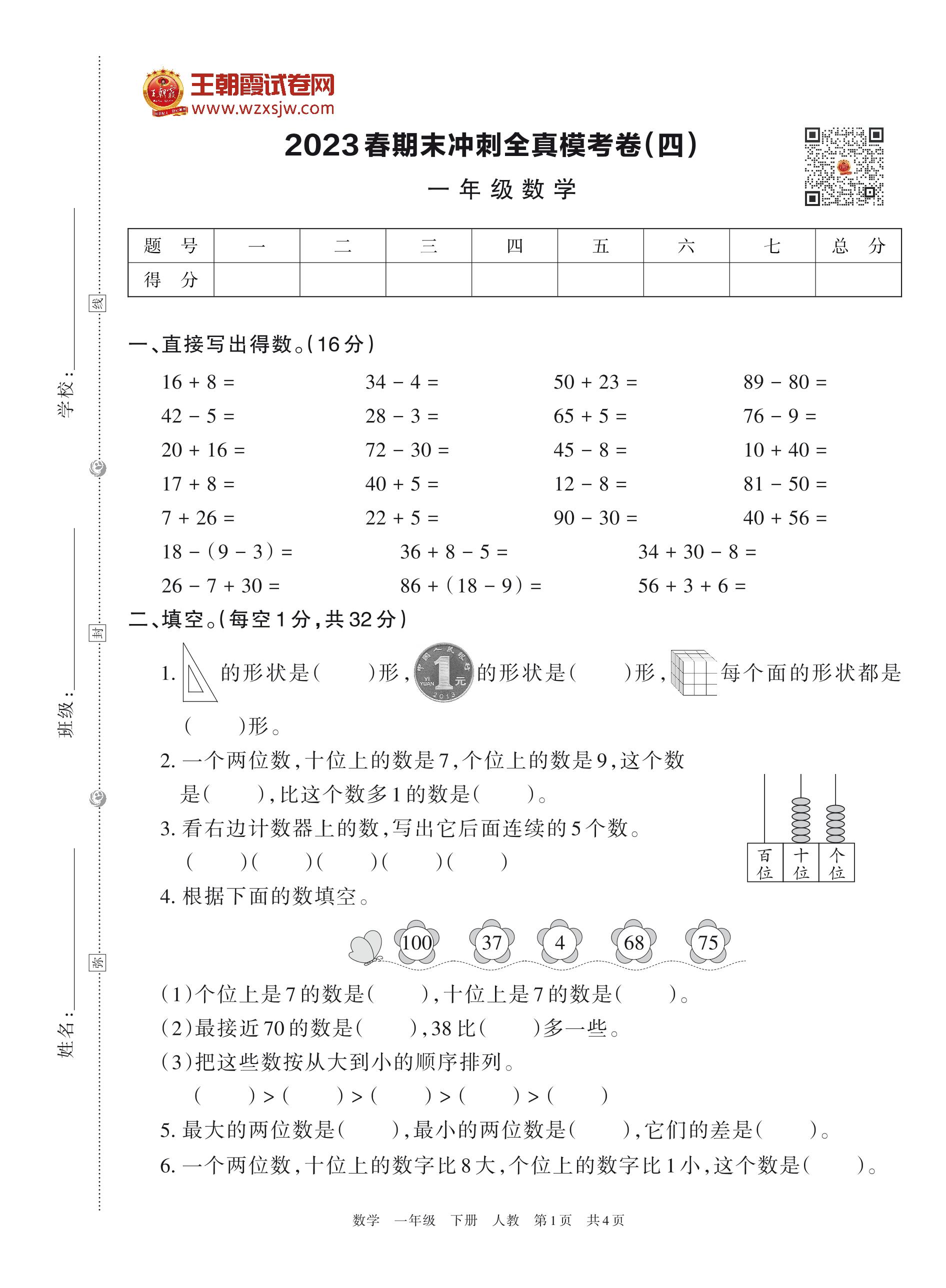 2023春期末冲刺全真模考卷(四)一年级数学(人教版)